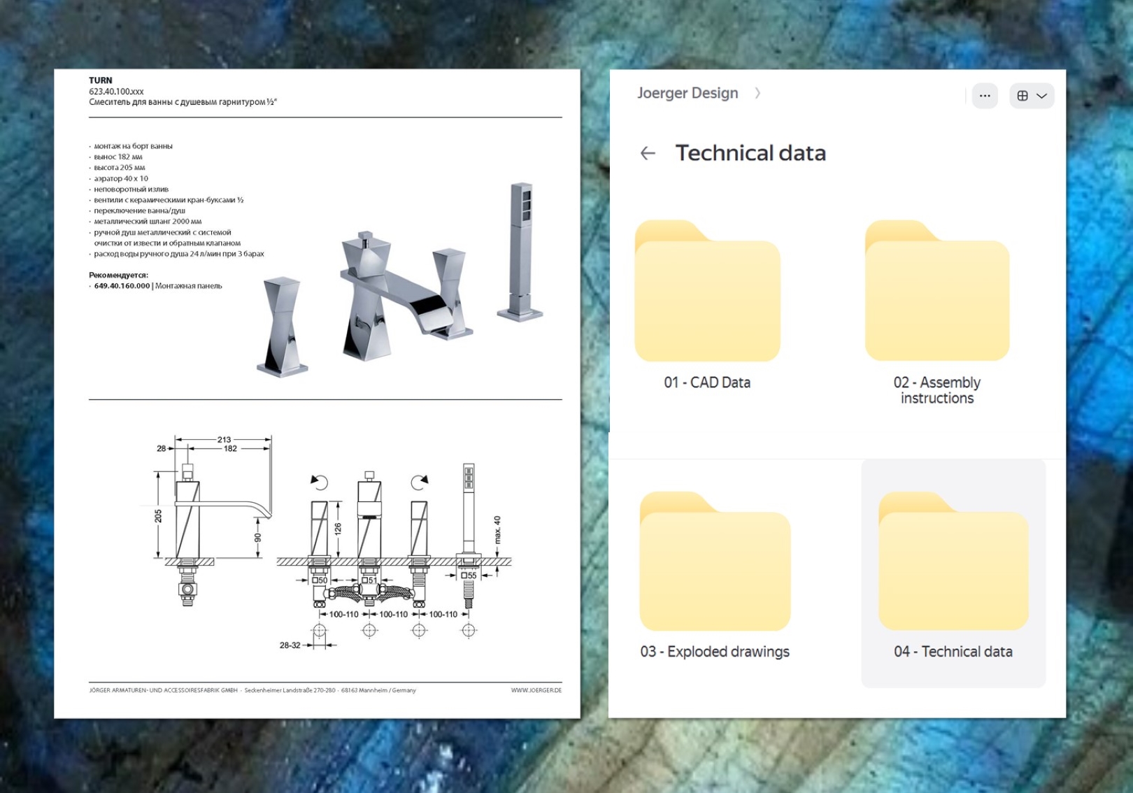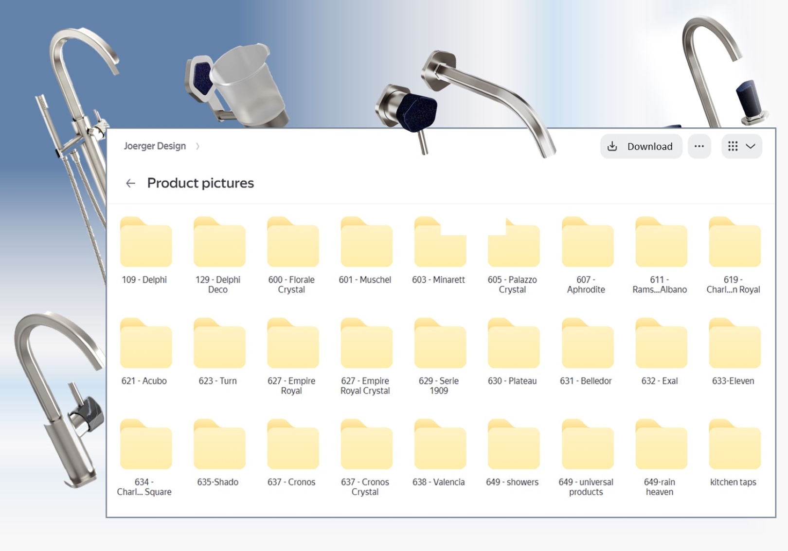„Product Pictures“ umfasst freigestellte Abbildungen einzelner Artikel für Angebote und Spezifikationen, gegliedert in 23 Ordner – entsprechend den Armaturen-Serien von JÖRGER DESIGN.