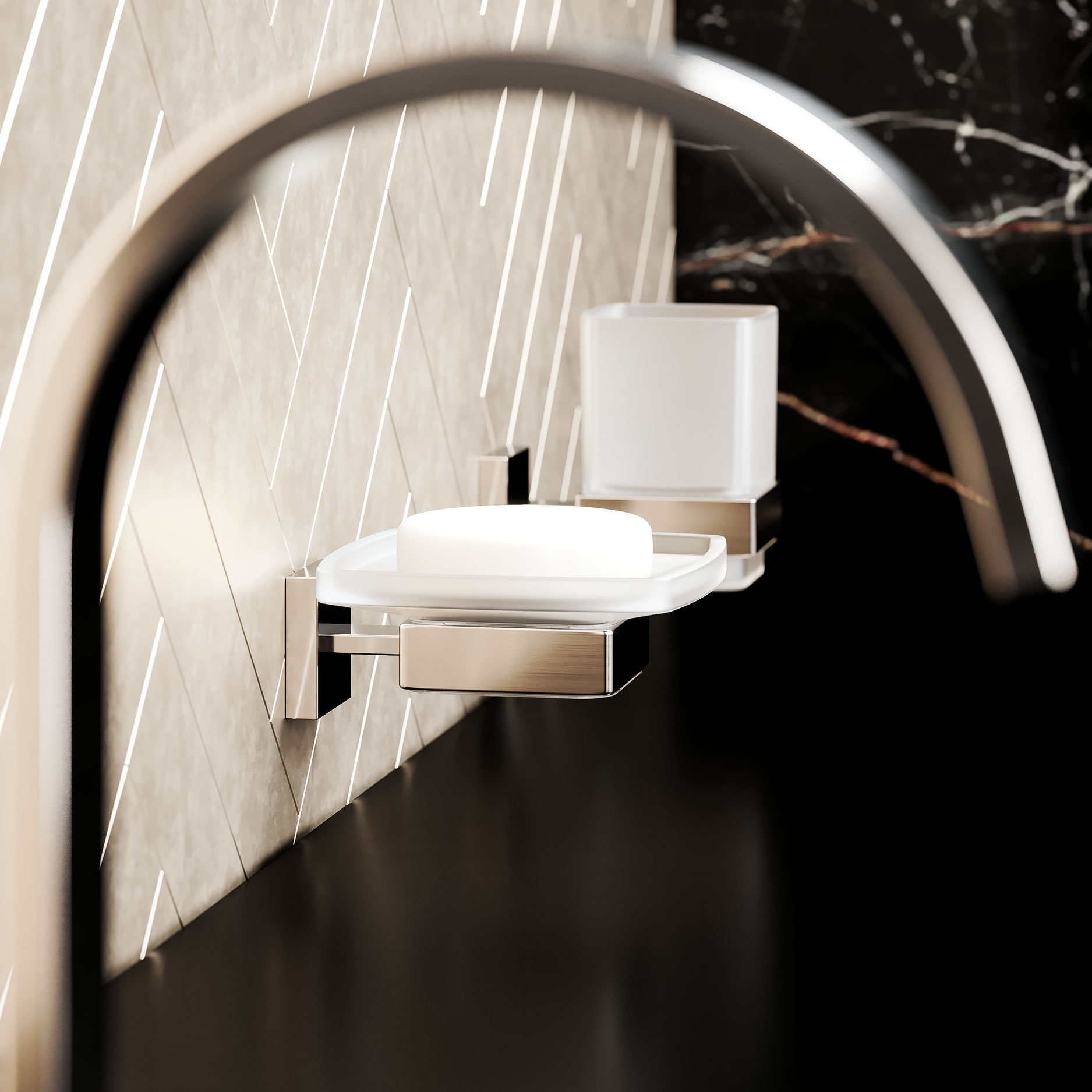 Seifenhalter und Glashalter | Serie Shadó in Edelmessing mit weißem Türkis