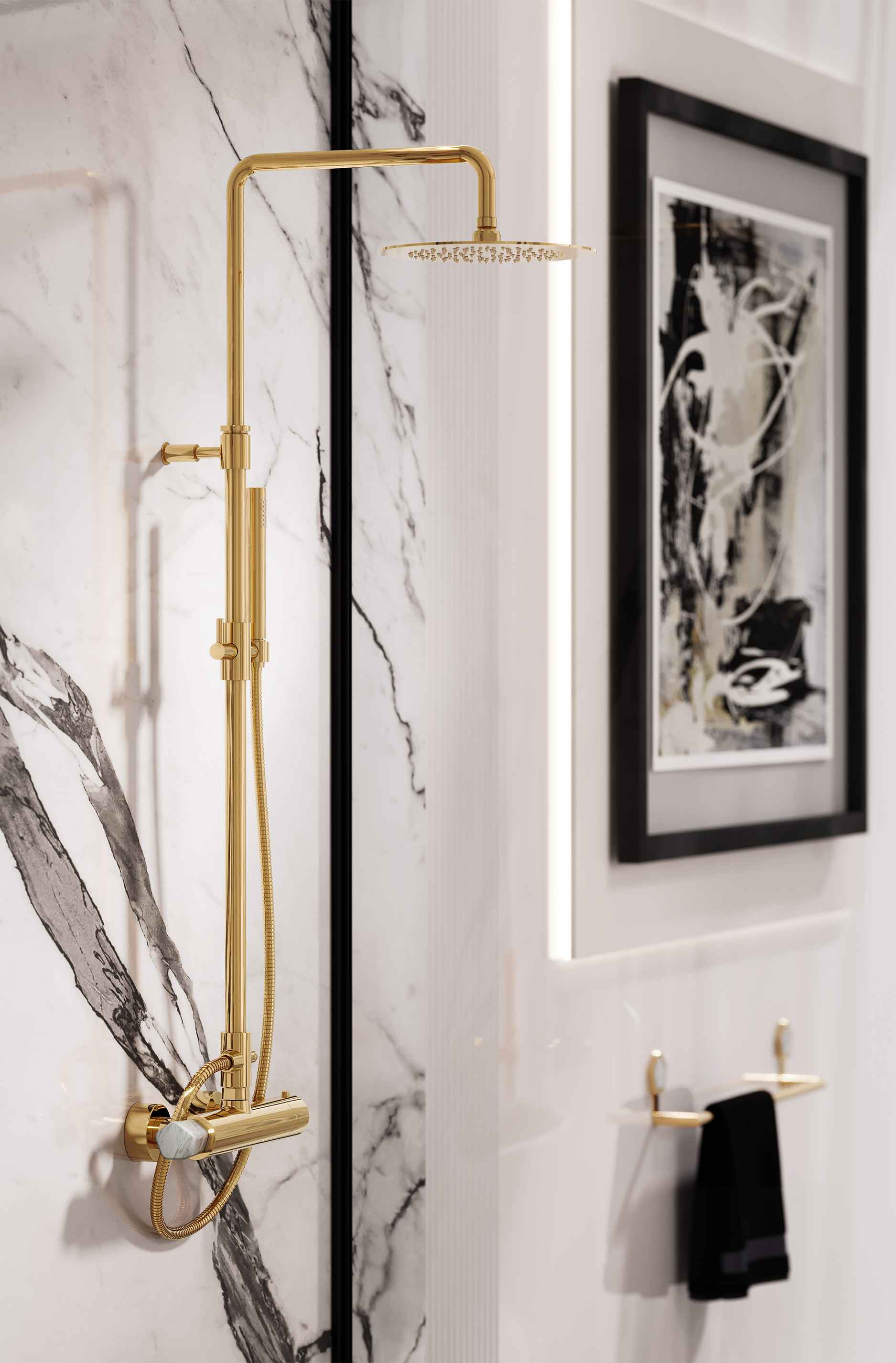 Aufputzset mit Steigrohr, Brausethermostat und Accessoires | Serie Cronos Crystal in Gold matt