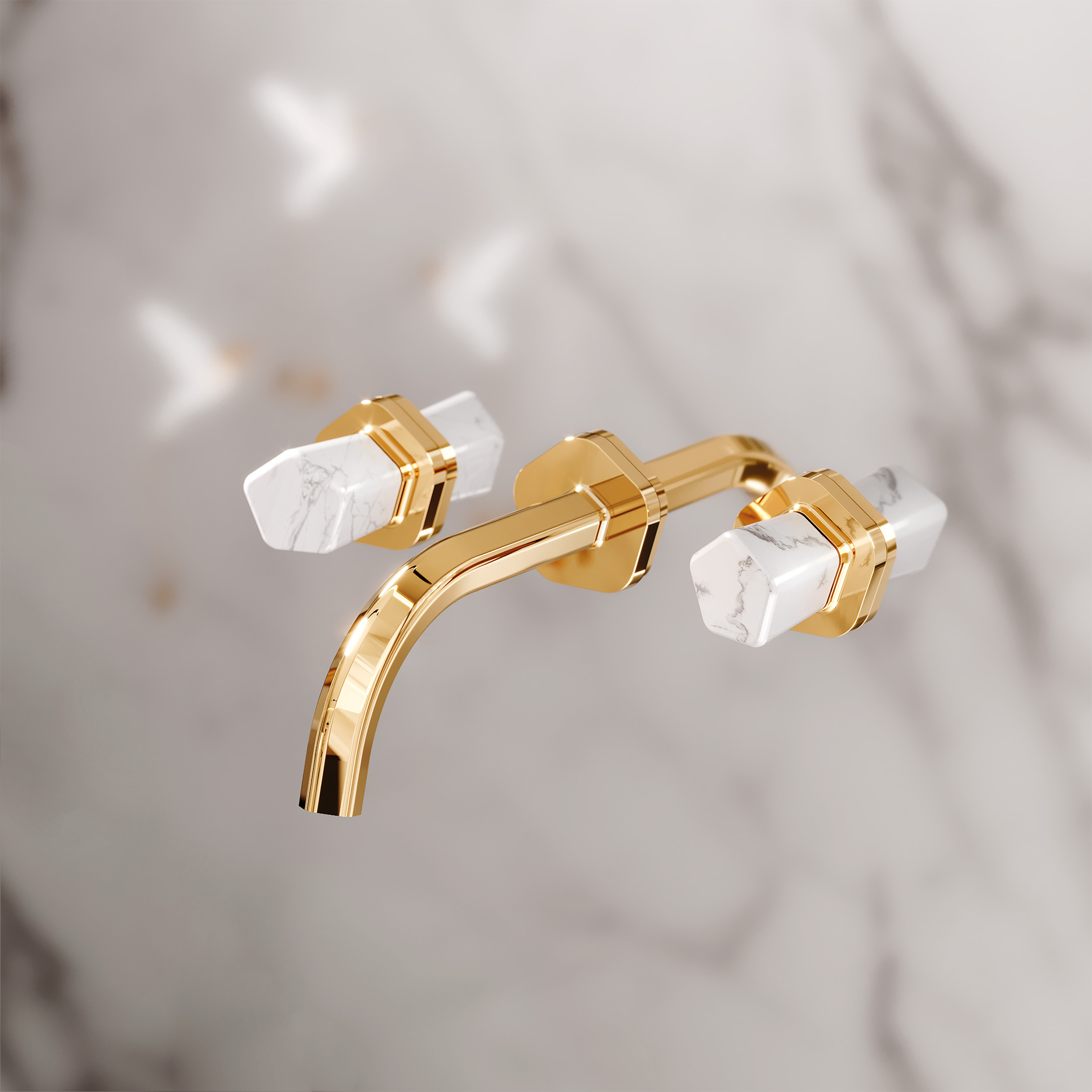 Wand-Waschtisch 3-Loch Batterie | Serie Shadó in Edelmessing mit weißem Türkis