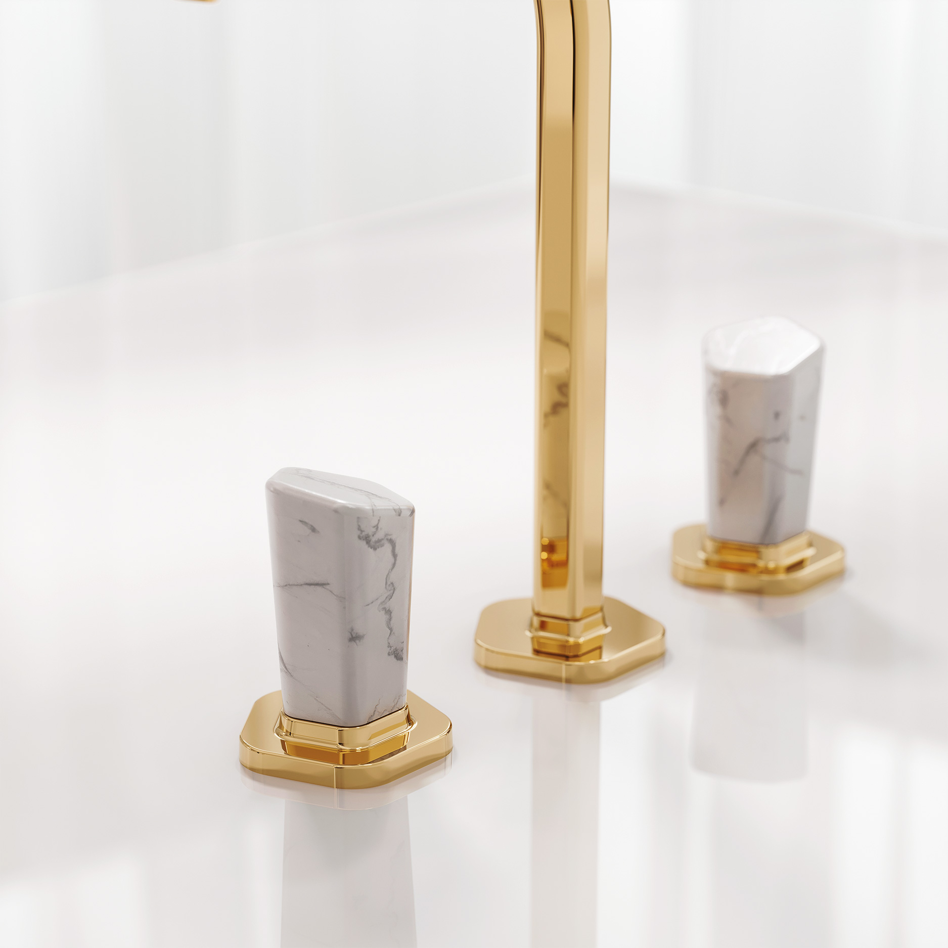 Waschtisch 3-Loch Batterie | Serie Shadó in Edelmessing mit weißem Türkis