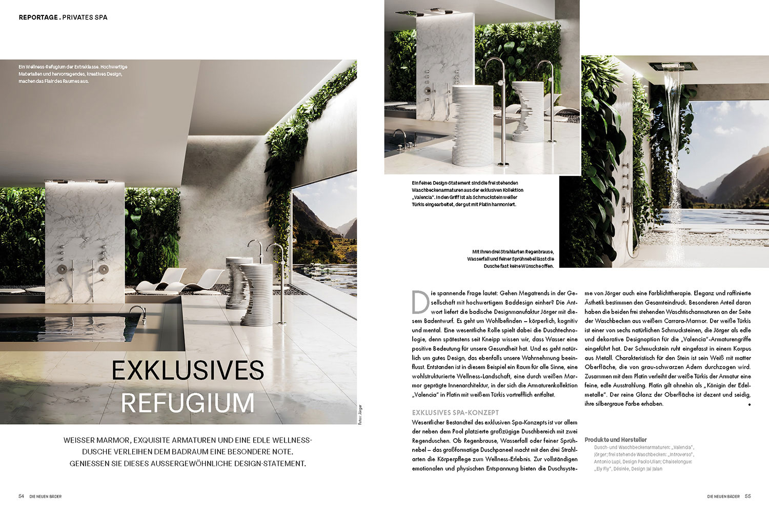 This is the inviting beginning of the article titled “Exclusive refuge”, illustratively presenting Jörger’s wellness oasis with “Valencia” in platinum with white turquoise on a beautifully designed spread.