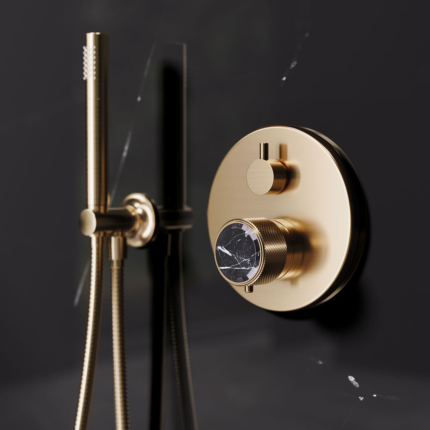Iconic fitting design, avant-garde bathroom concept, exclusive materials: Jörger presents a jewellery design of surprisingly luxurious and sophisticated aesthetics with “Valencia” in Sunshine matt with black marble, perfectly presented in a boldly designed bathroom interior. This universe seems to live up to Coco Chanel’s words:“La mode se démode, le style jamais.” (Fashion goes out of fashion, but style never does.)