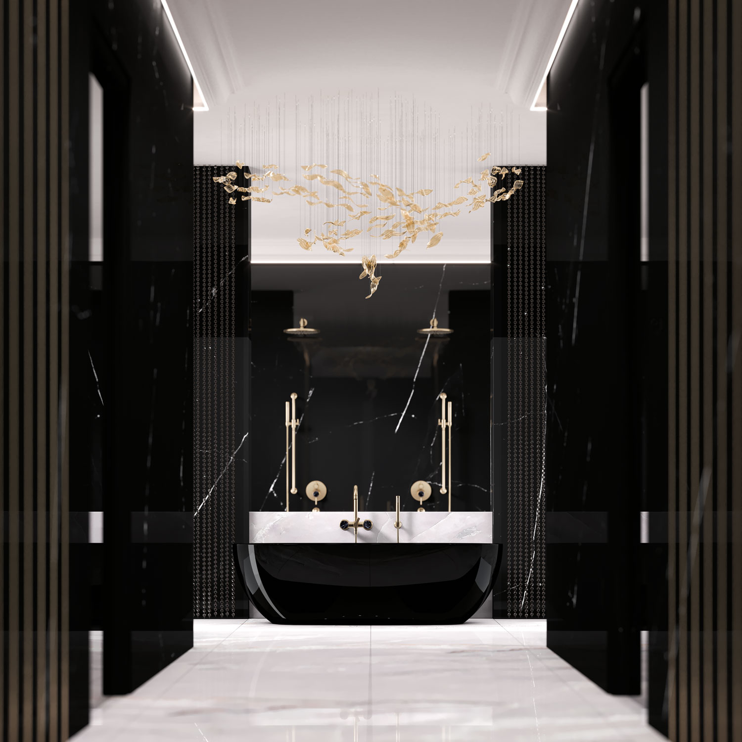 High, downright palatial ceilings, black marble walls, ascetic pillars serving as mute sentinels, and floating luminous, glossy golden crystal leaves – all of this together forms the space of timeless beauty for and with Jörger’s “Valencia” in Sunshine matt with black marble.