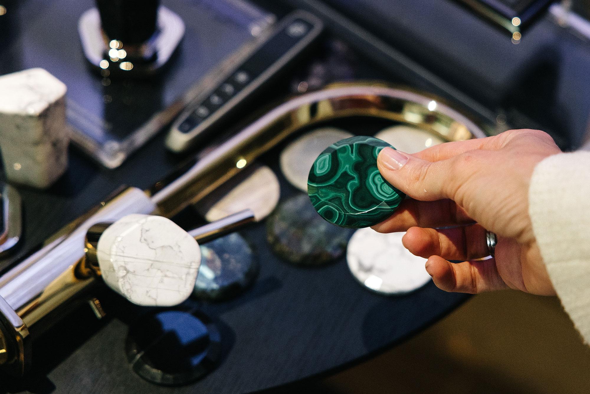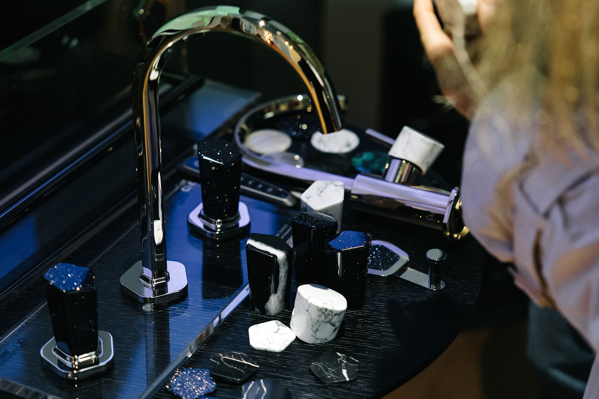 Обсуждая новые смесители Shadó с ручками из декоративного камня, гости не могли не вспомнить предыдущую коллекцию Jörger c декором из драгоценных и полудрагоценных камней, безусловный бестселлер последних лет – Valencia, еще раз оценили декоративные вставки в ручки смесителя из малахита, аметиста, лабрадорита и других природных самоцветов.
