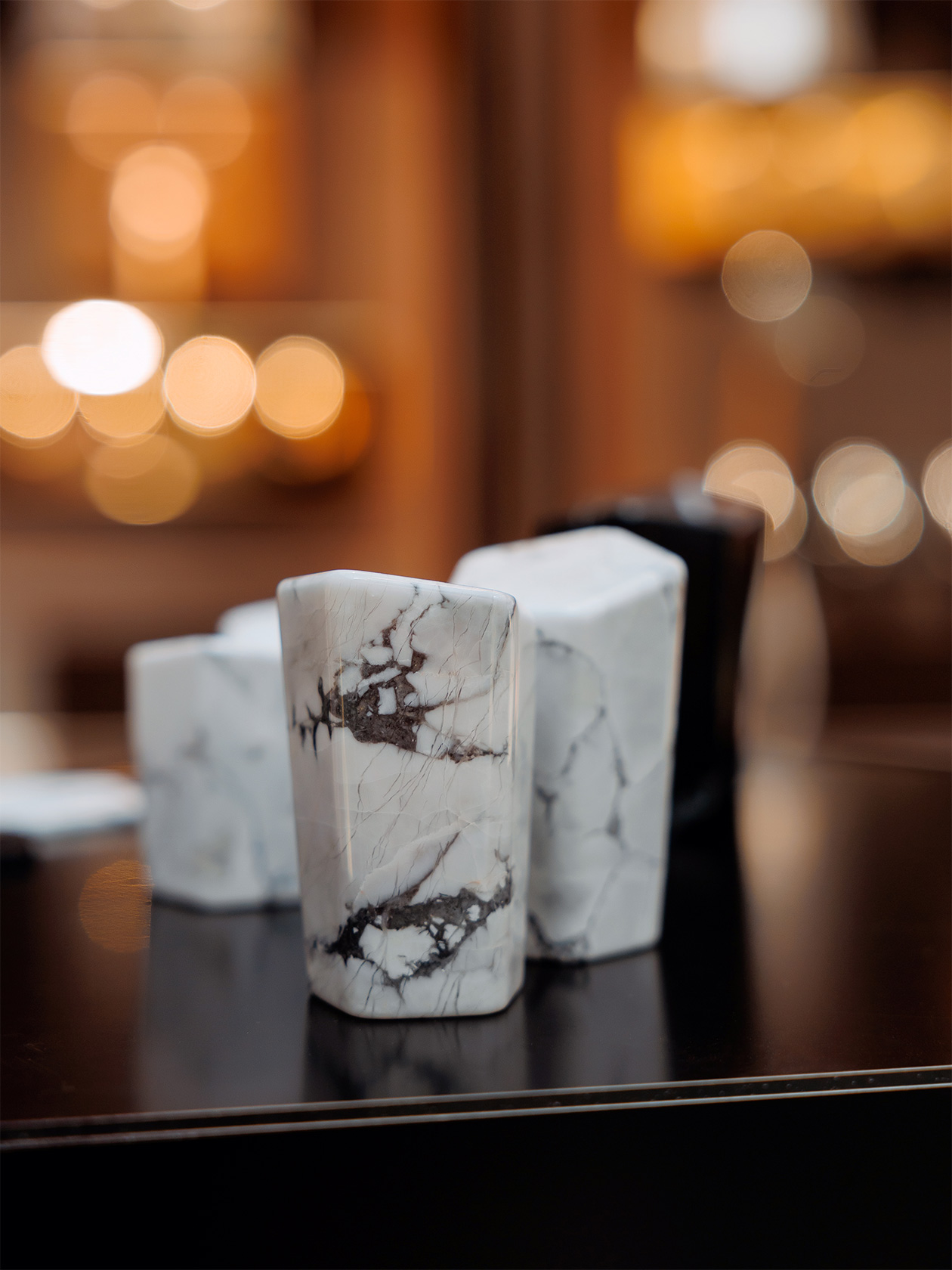 Каждый образец демонстрировал одну из многочисленных комбинаций отделок Shadó: серебристый никель и искрящийся синий авантюрин, матовый Nerz и черный мрамор, благородная латунь и белая бирюза. Также отдельным сетом можно было увидеть ручки разной высоты из белой бирюзы и черного мрамора.