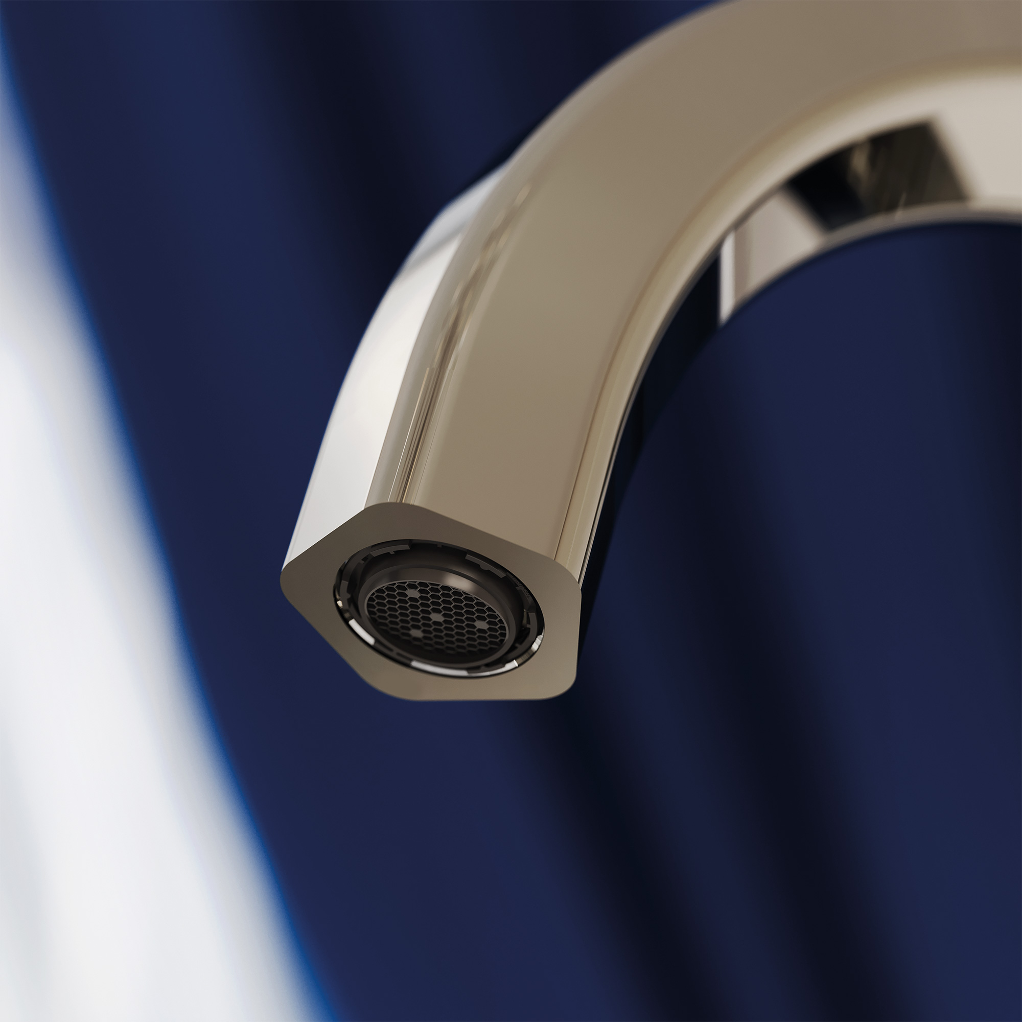 Атласной струящейся мантией серебристый никель обволакивает корпус смесителей и душевого гарнитура Shadó и изящно подчеркивает рельефный силуэт излива и точную геометрию розеток смесителя в виде пятигранника.