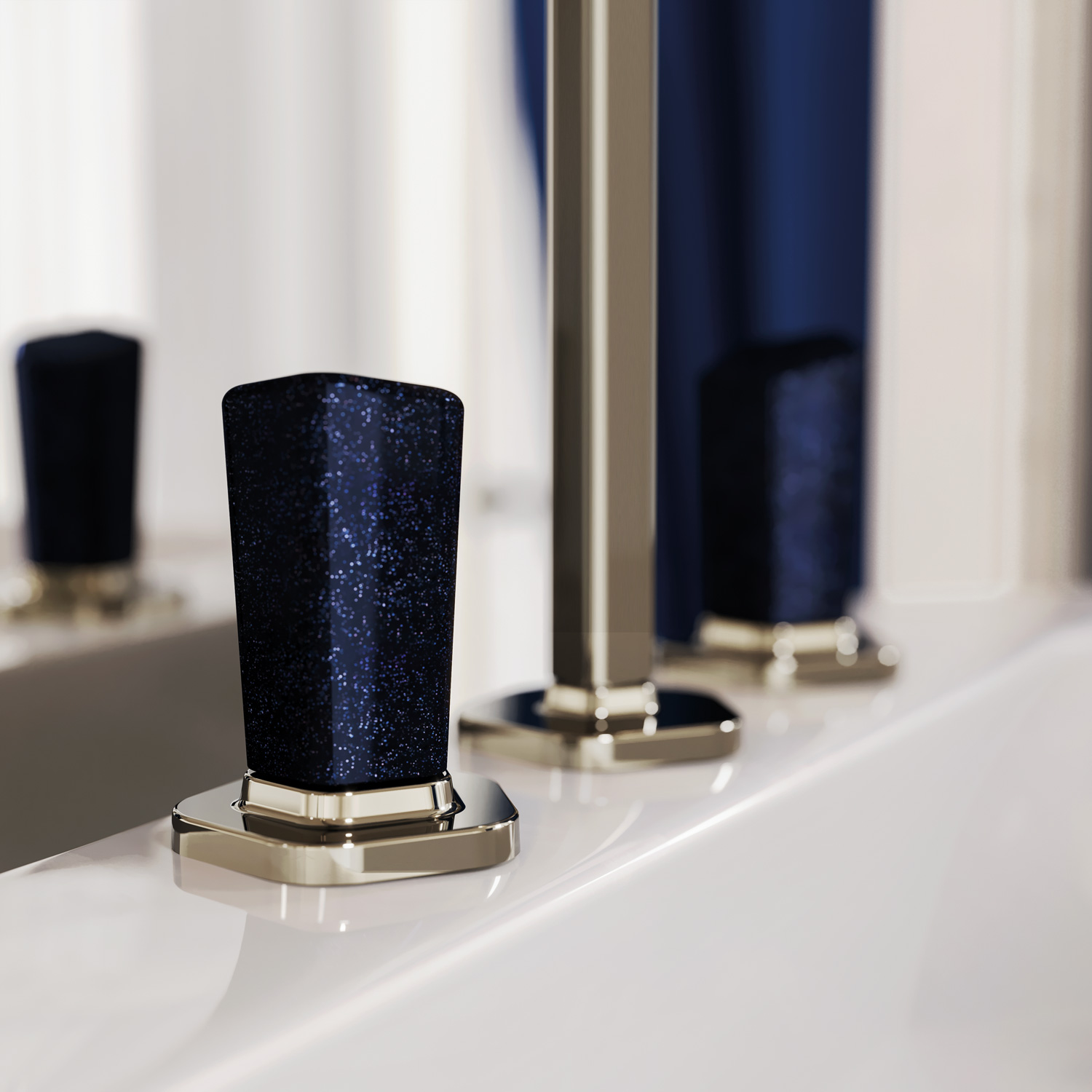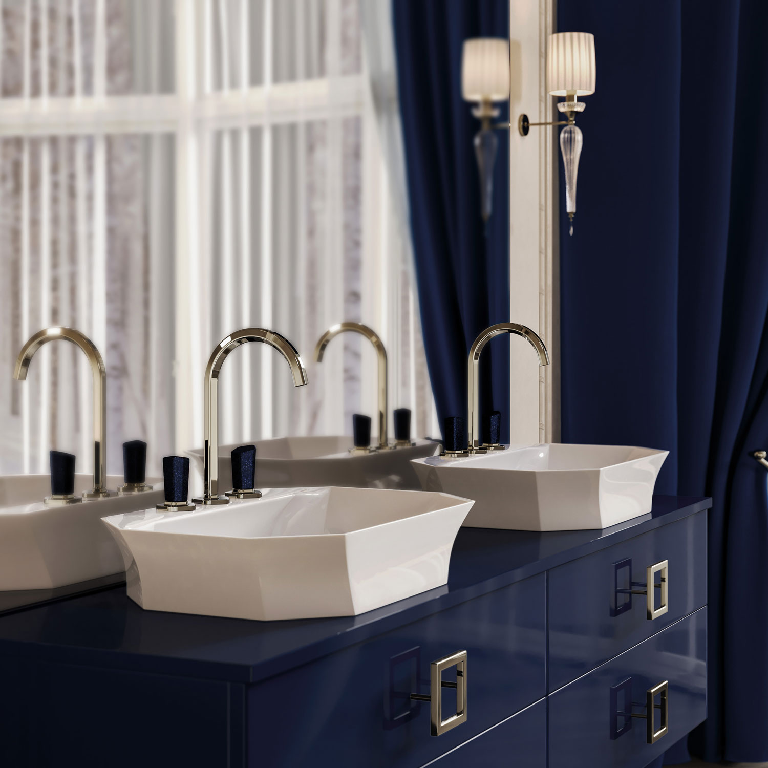 Жить ярче, чем в кино. Артистичный, колоритный, богато декорированный, эффектный, чувственный кинематографичный интерьер с элементами art decó - Jörger Design представляет смесители новой юбилейной коллекции Shadó в роскошном вечернем образе: в серебристом никеле с синим авантюрином.