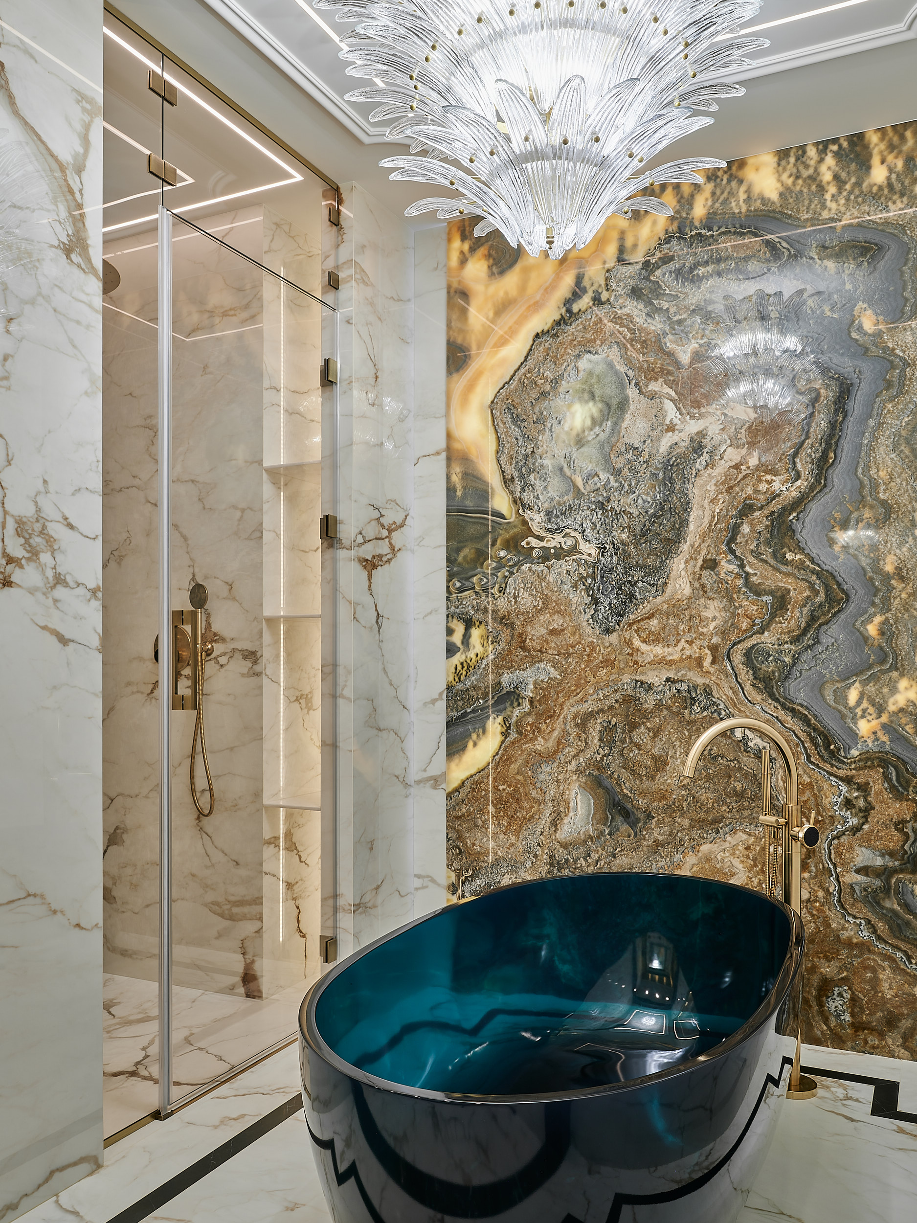 Смысловой центр второй зоны – овальная ванна из стекла кобальтового цветаи напольный однорычажный смеситель VALENCIA с ручным душем. Глубокая оптика граненого черного кристалла в декоре ручки VALENCIA перекликается с живописным рисунком оникса на стене. Панно из натурального камня с выразительной текстурой - визуальный акцент этой части интерьера и одновременно компонент, колористический объединяющий все 3 части помещения в единый образ.