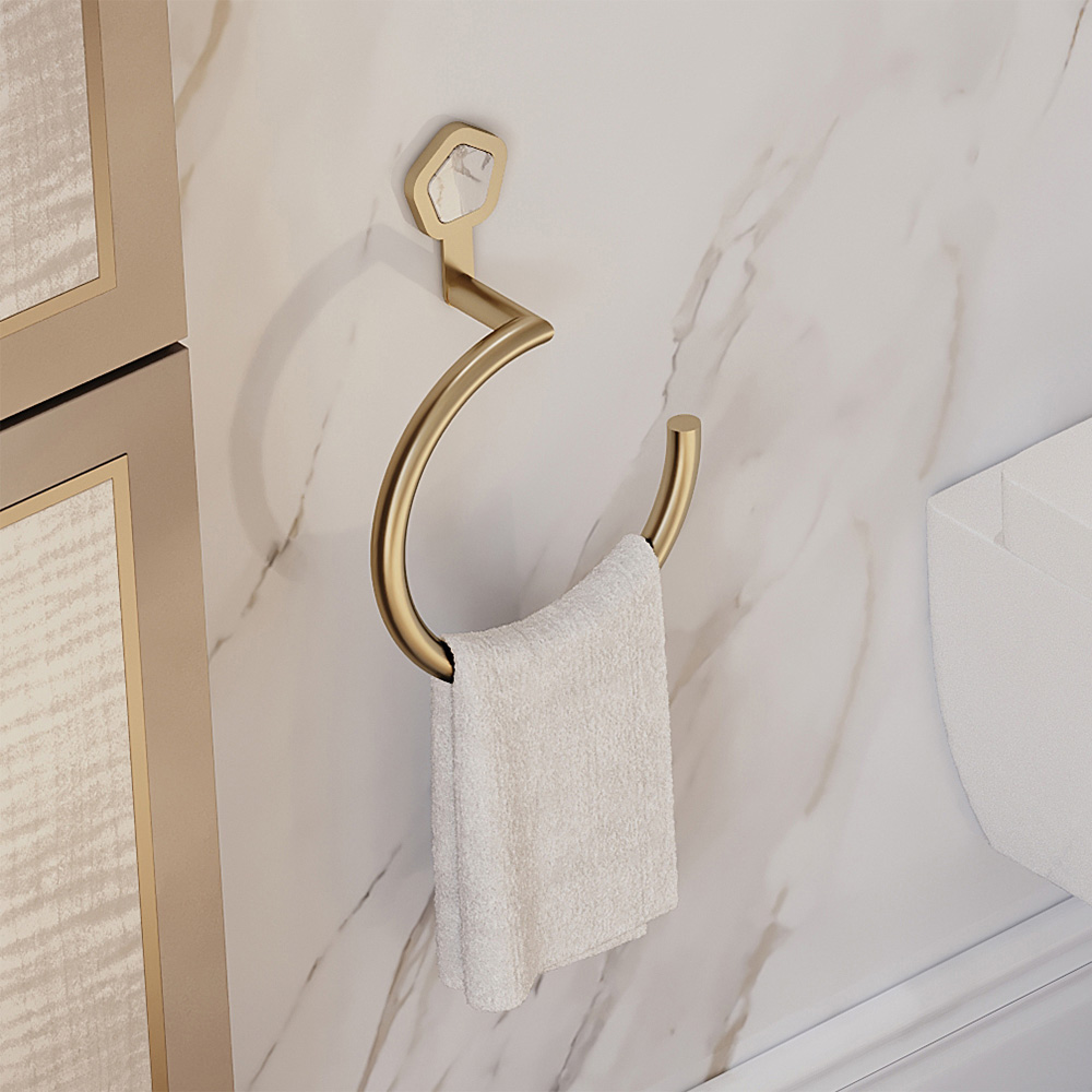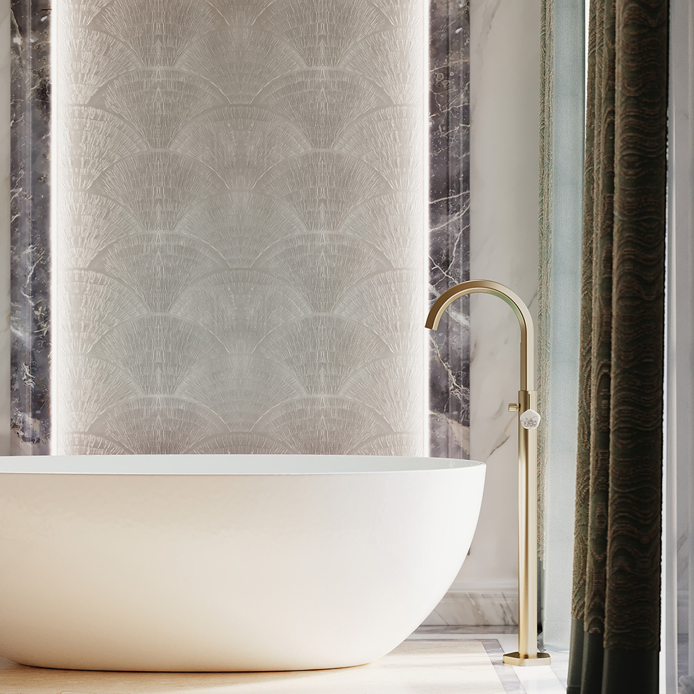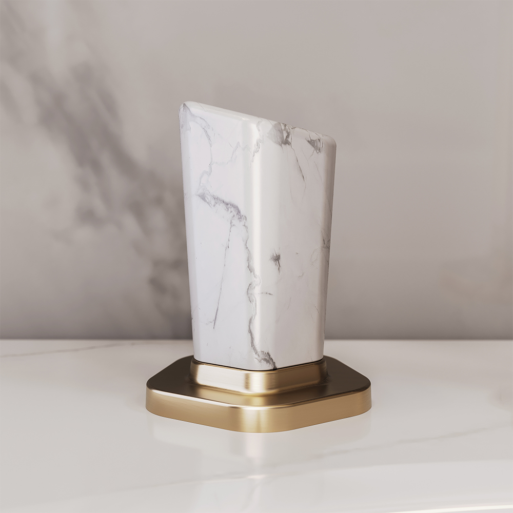 Ручки-стелы Shadó подчёркивают богатство натурального камня, привнося в интерьер выразительность, изысканность и шарм. Объемная форма пятигранника с деликатно скругленными краями позволяет в полной мере раскрыть тонкую красоту и причудливый рисунок белой бирюзы. В форме пятигранника выполнены также излив смесителя, розетки ручек и аксессуаров, корпус термостата. Благородный финиш из матовой брашированной латуни с 18-каратным золотом и тонкий профиль излива перекликаются с изящной окантовкой рамы зеркала.