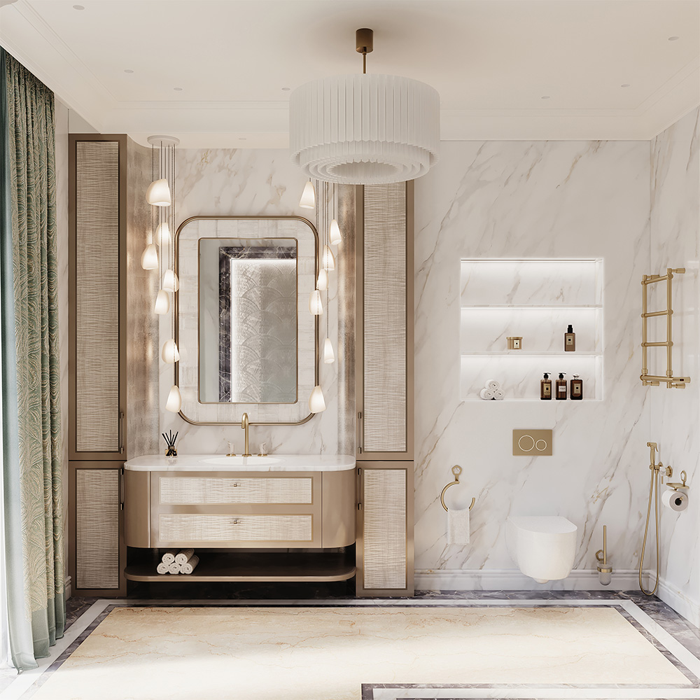 В представленной ванной комнате дизайнер использовала несколько видов природного камня, созвучных по цветовой гамме и рисунку: в декоре стен - мрамор Calacatta, в отделке пола – натуральный мрамор Fior di Bosco бежевых тонов и Bardiglio для серой окантовки.