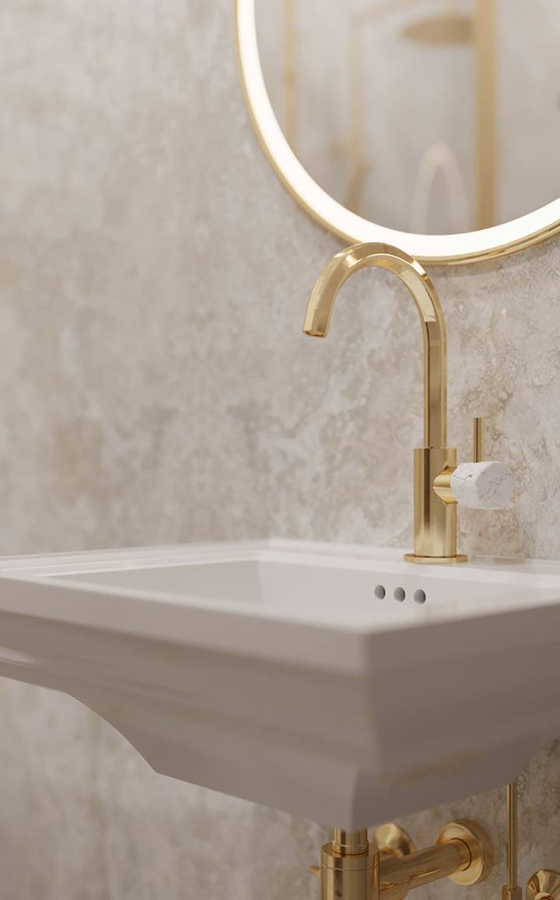 Светлый мрамор с крупным природным рисунком в виде прожилок стал ключевым материалом для отделки стен и пола, добавил в интерьер изысканную текстуру и визуально расширил пространство. Металлические элементы: смесители, потолочная душевая панель, полотенцесушитель, светильники, ограждение душевой кабины и мебельная фурнитура выполнены в декоре из благородной латуни. Солнечные блики позолоченной латуни подчёркивают благородство образа и добавляют теплые нотки, гармонично сочетаясь с холодной утончённостью мрамора. Эта тонкая игра фактур создаёт ощущение сдержанной роскоши, не перегружая интерьер.