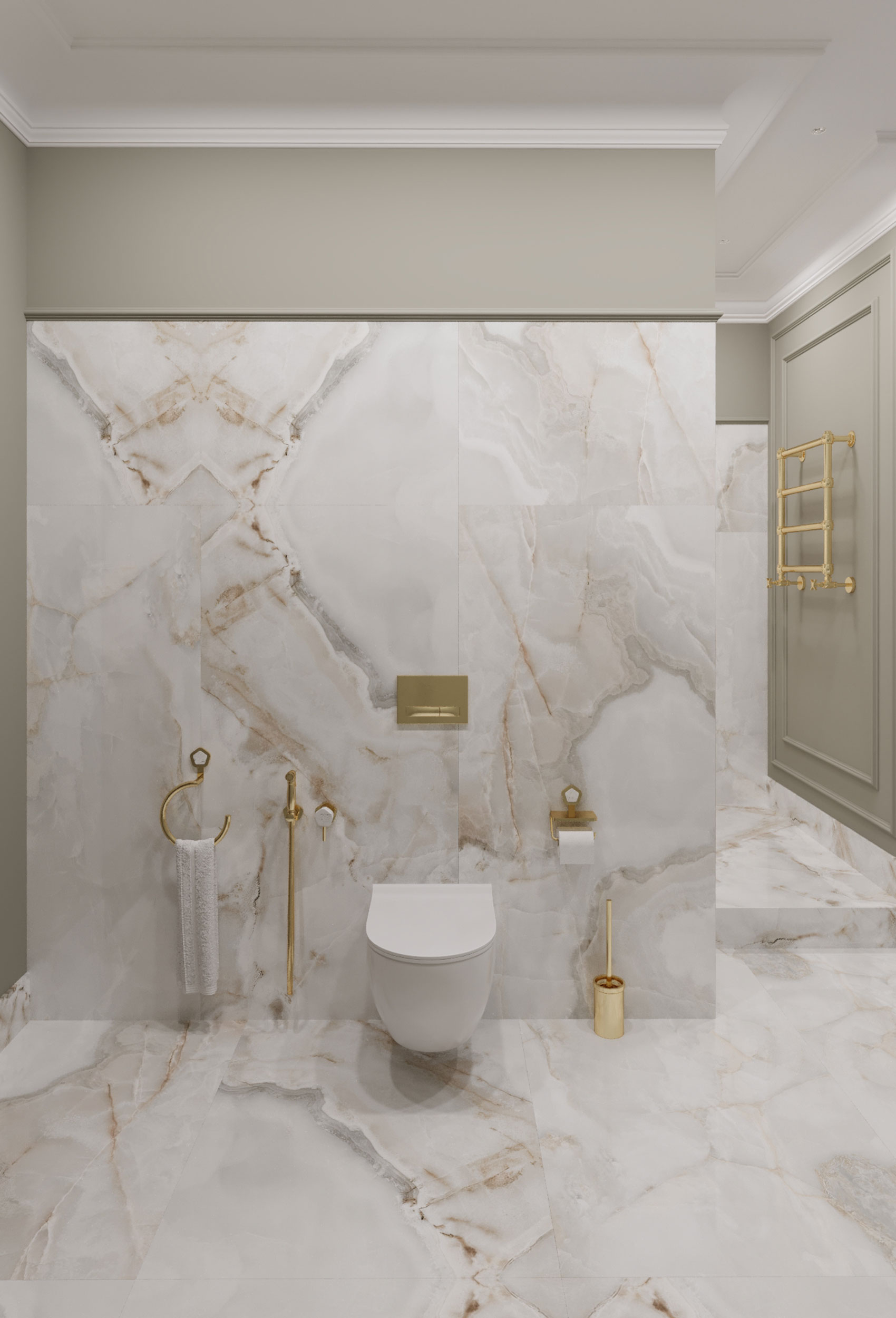 Светлый мрамор и благородная латунь: респектабельная неоклассика в интерьерах ванной Марины Лоцман