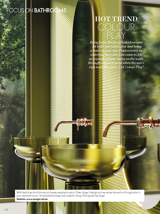 This is the personal and beautiful introduction “Elle Decor India” gives its Indian audience to Jörger’s green wellness oasis, with “Valencia” in rose gold with labradorite casting its spell on the senses and touching the soul. The beautifully illustrated article titled “Hot Trend Colour Play” is on page 10 in the current print edition. It has been on the market since June 2023 and continues to be available under elledecor.in/elle-decor-india-magazine.