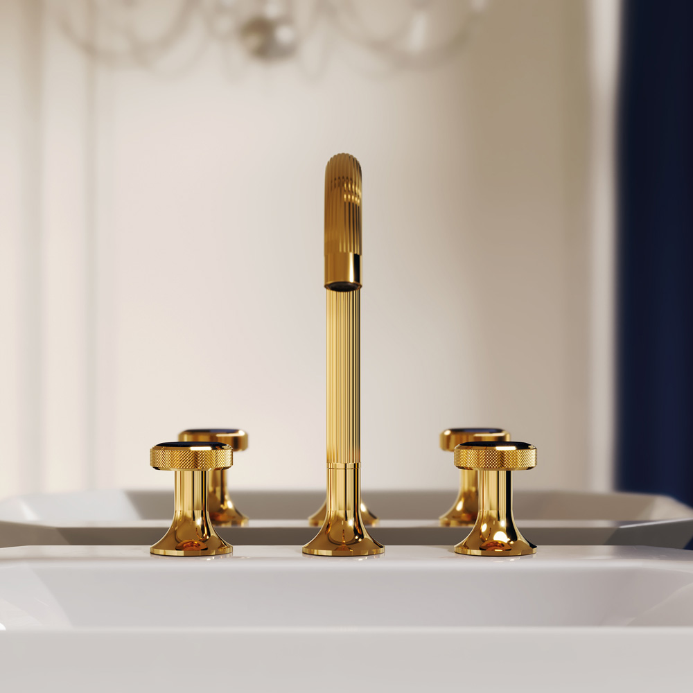 Of course, the signature feature of the VALENCIA collection is also a must for this project: the perfect handle inlay. The luxurious 24-carat gold finish is set off to perfection by the precious Blue Aventurine. The Blue Aventurine is one of eight natural stones that adorn the handle insert of the faucets with their glittering appearance.