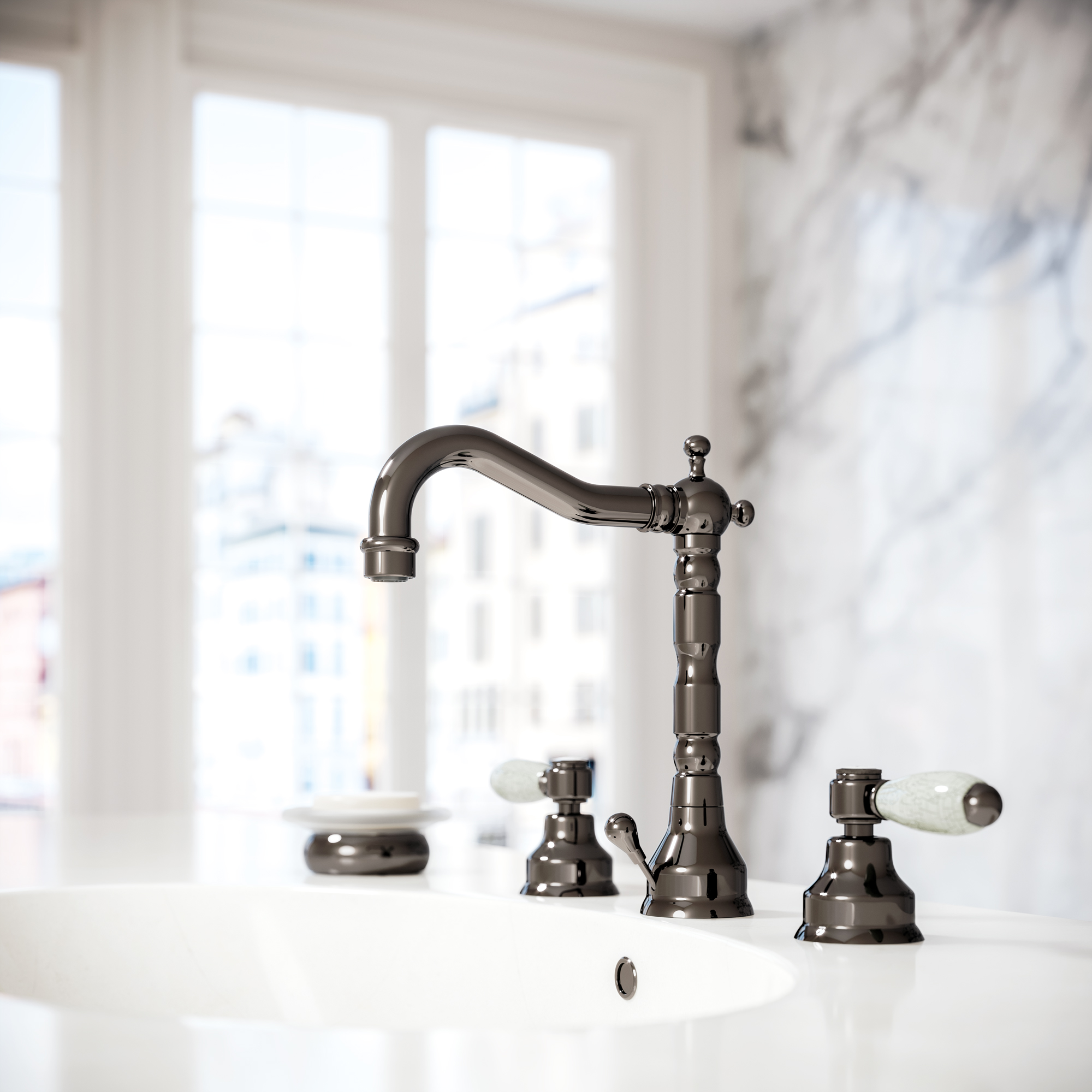 Für den Vintage-Stil jedoch bietet sich eine andere, neue „Delphi“-Designvariante an. Gemeint sind die Hebelgriffe aus weißem Porzellan, das von einem feinen Netz aus „Krakelee“ überzogen ist. Die Oberfläche scheint von haarfeinen Rissen und Sprüngen durchsetzt zu sein. Das leicht verwittert anmutende Erscheinungsbild der Griffe verleiht der ganzen Armatur den gewissen Vintage-Look. Für den Gesamteindruck spielt das gewählte Finish eine tragende Rolle.