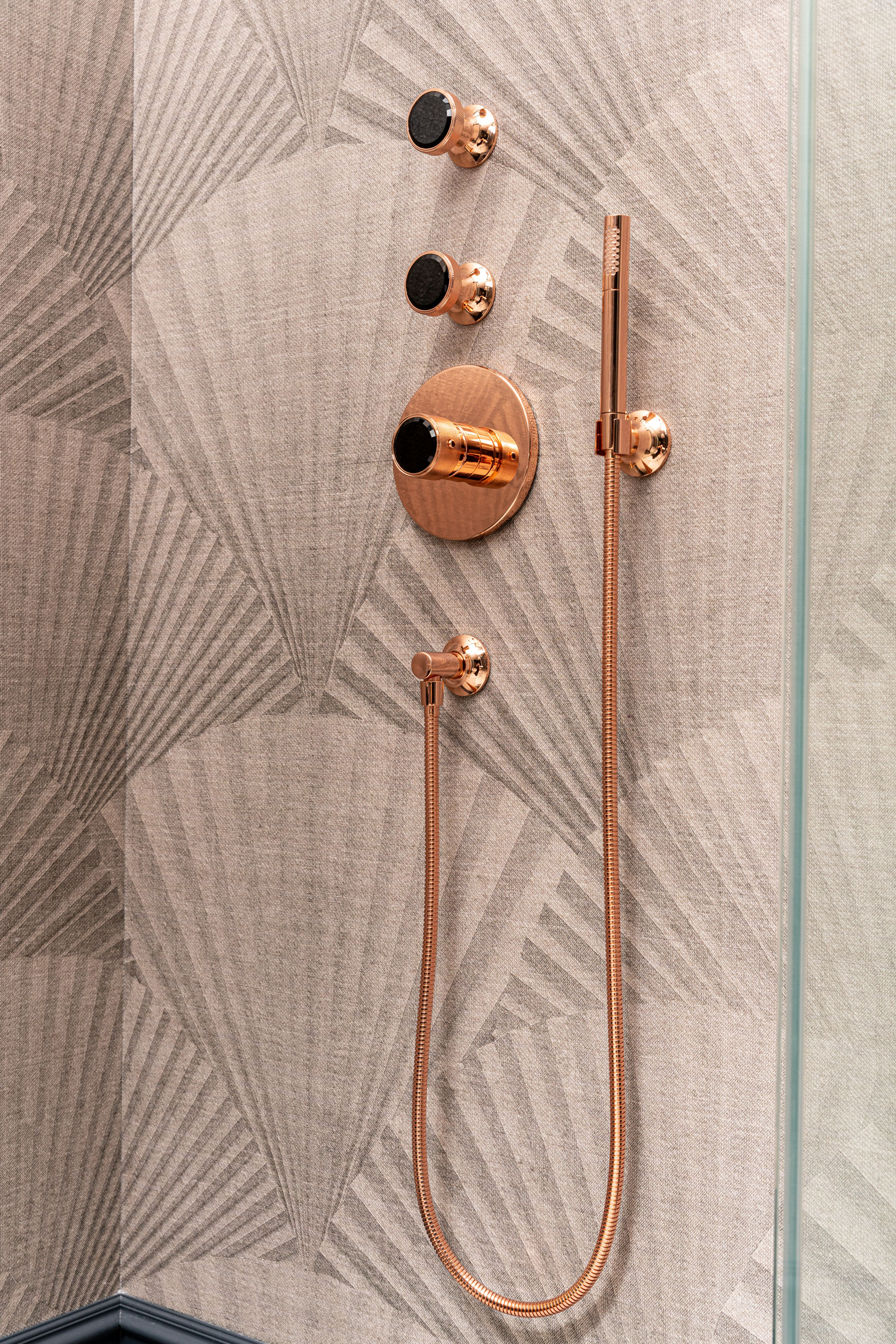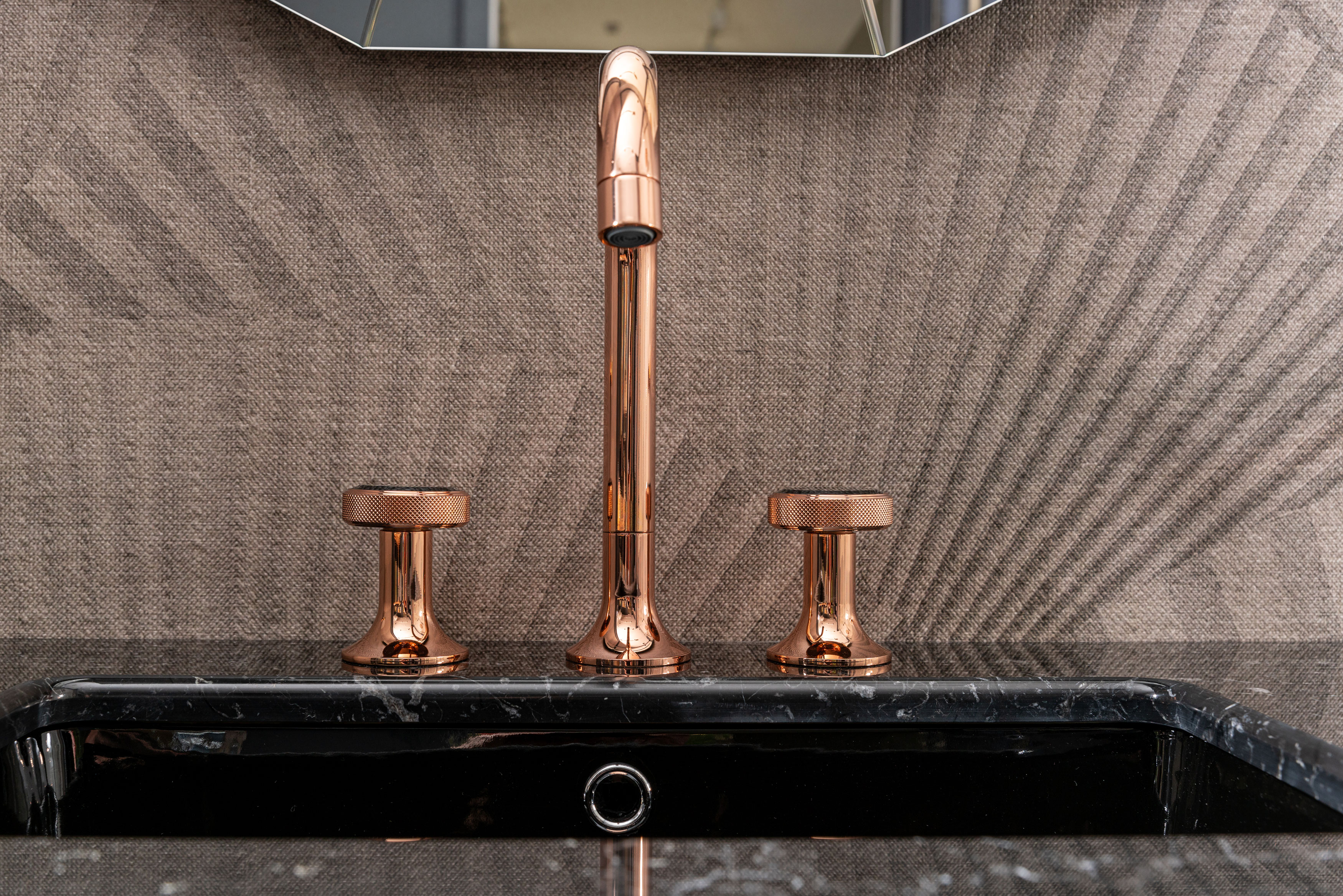 Fotos, die direkt vor Ort aufgenommen wurden, zeigen ein sehr geschmackvoll eingerichtetes, außergewöhnlich schönes Bad mit in Roségold glänzenden „Valencia“-Armaturen und Accessoires.