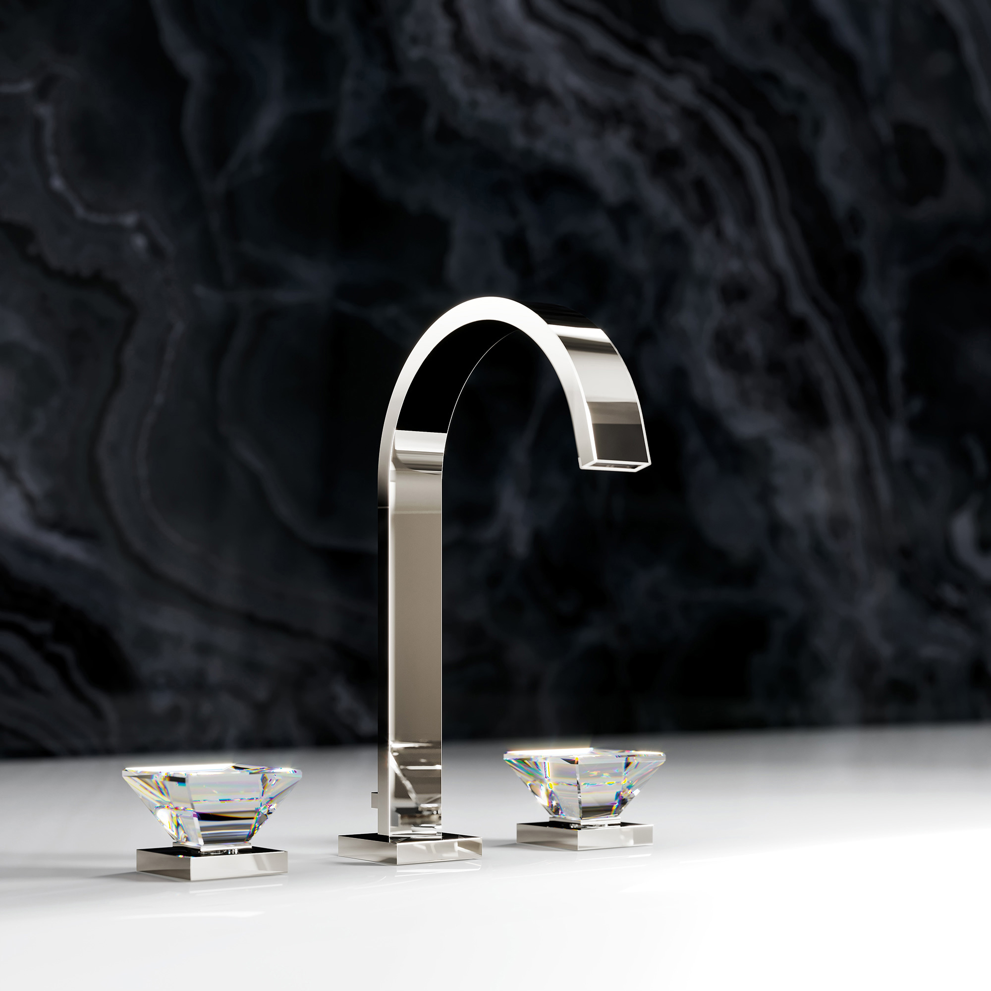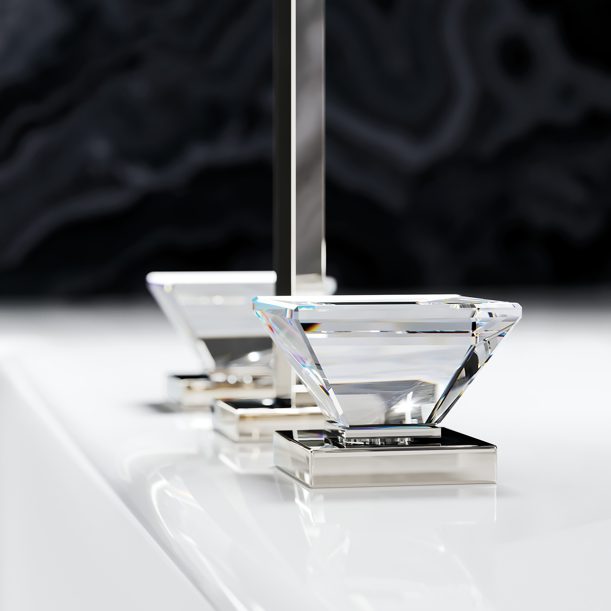 Ihre besonders dekorative Wirkung entfalten die Kristallgriffe im spannungsreichen Zusammenspiel mit dem puristisch-minimalistischen Armaturendesign, das „Empire Royal Crystal“ mit der Basisserie „Empire Royal“ teilt. Sie bewahren den cleanen Look der Armatur und fügen gleichzeitig ein Element üppigen Schmucks hinzu, das nahezu jedes Badezimmer in die Höhe von wahrem und sinnlichen Luxus hebt.