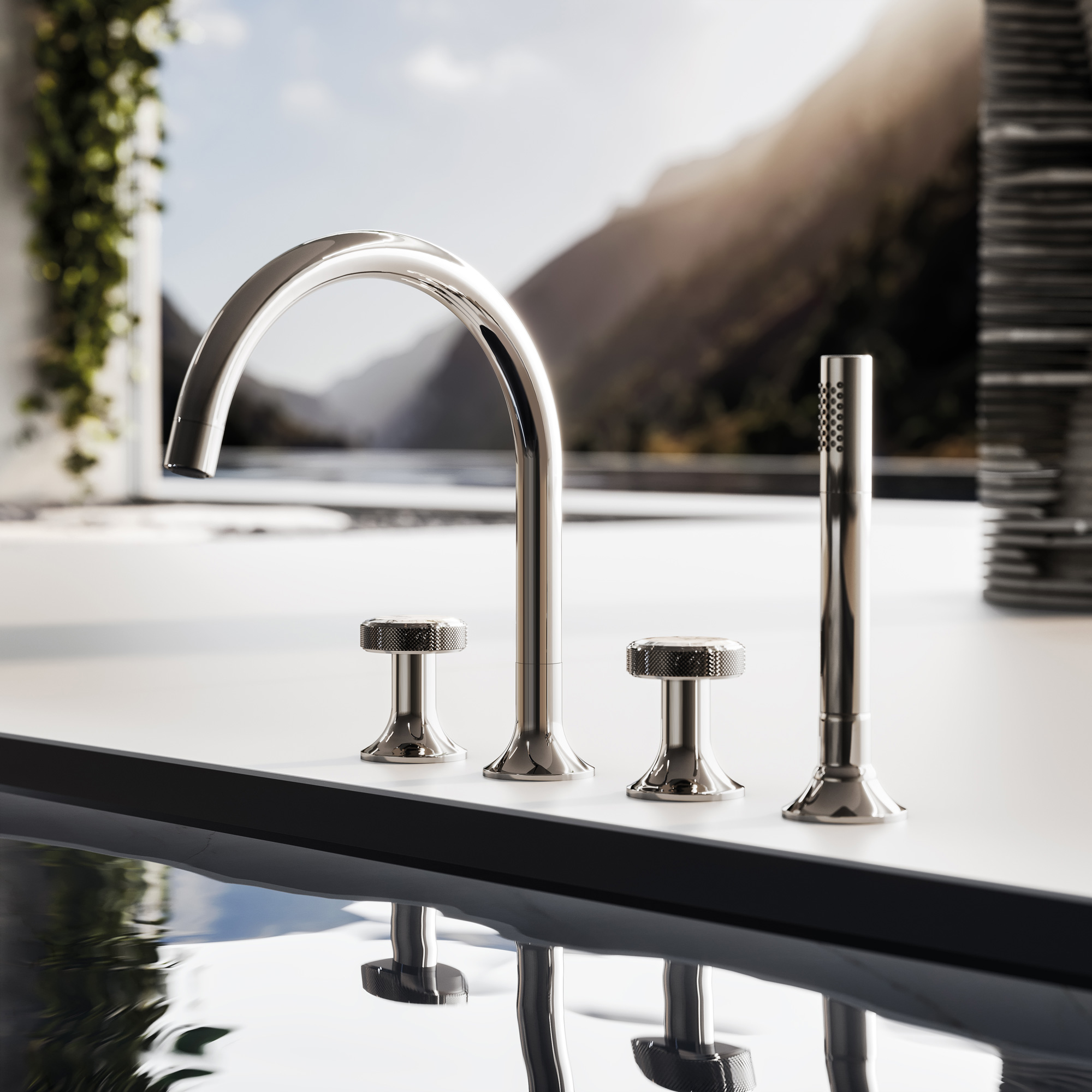 Zusammen mit Platin verleiht der weiße Türkis den „Valencia“-Armaturen eine neue, außergewöhnlich ästhetische, feine und edle Ausstrahlung.