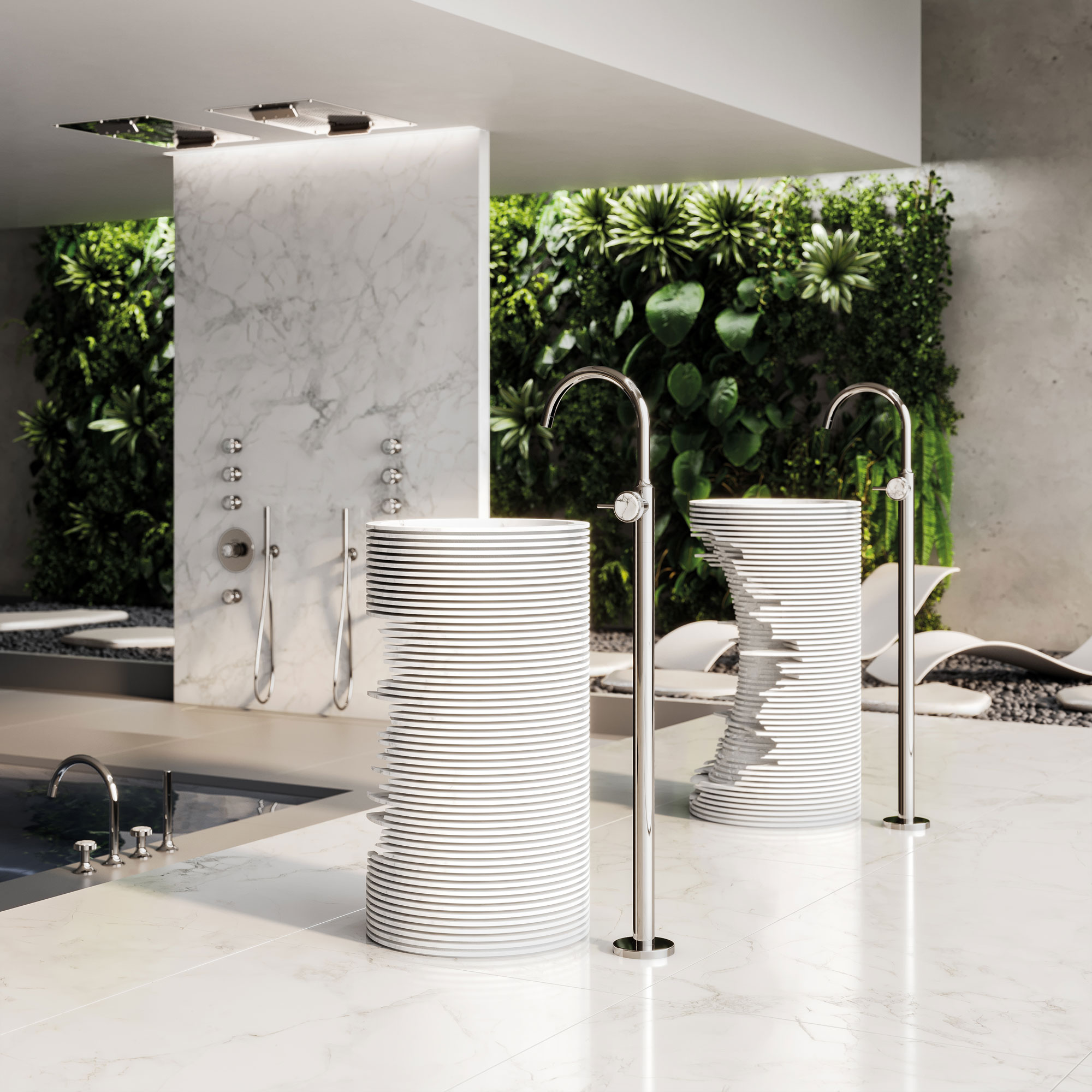 Eleganz und raffinierte Ästhetik bestimmen den Gesamteindruck. Besonderen Anteil daran haben zum einen die beiden frei stehenden „Valencia“-Waschtischarmaturen an der Seite der „Introverso“-Waschbecken aus weißem Carrara-Marmor von Antonio Lupi. Zum anderen die beiden weißen „Eli Fly“-Chaiselongues von Désirée, die als wahre Relaxmöbel hohen Liegekomfort bieten und dazu einladend chic und elegant aussehen. – Auftanken, zur Ruhe kommen und entspannen heißt die Devise!