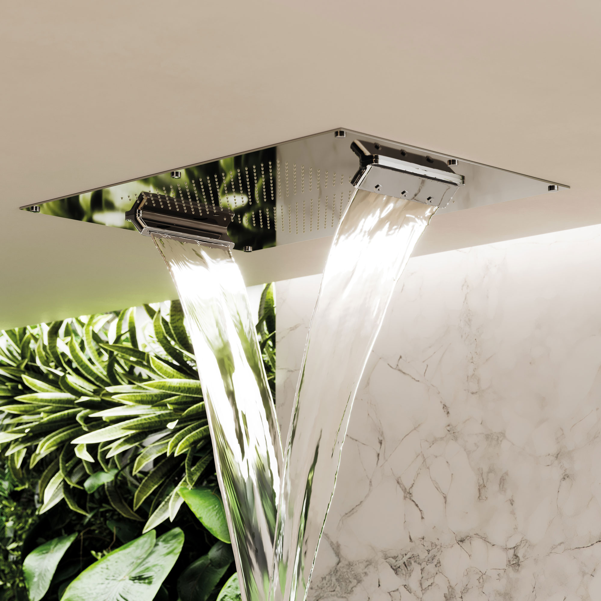 Auch ästhetisch sind die Decken-Duschpaneele ein Genuss, denn selbstverständlich sind sie im Design abgestimmt und wie die „Valencia“-Armaturen hochwertig mit Platin oberflächenveredelt.