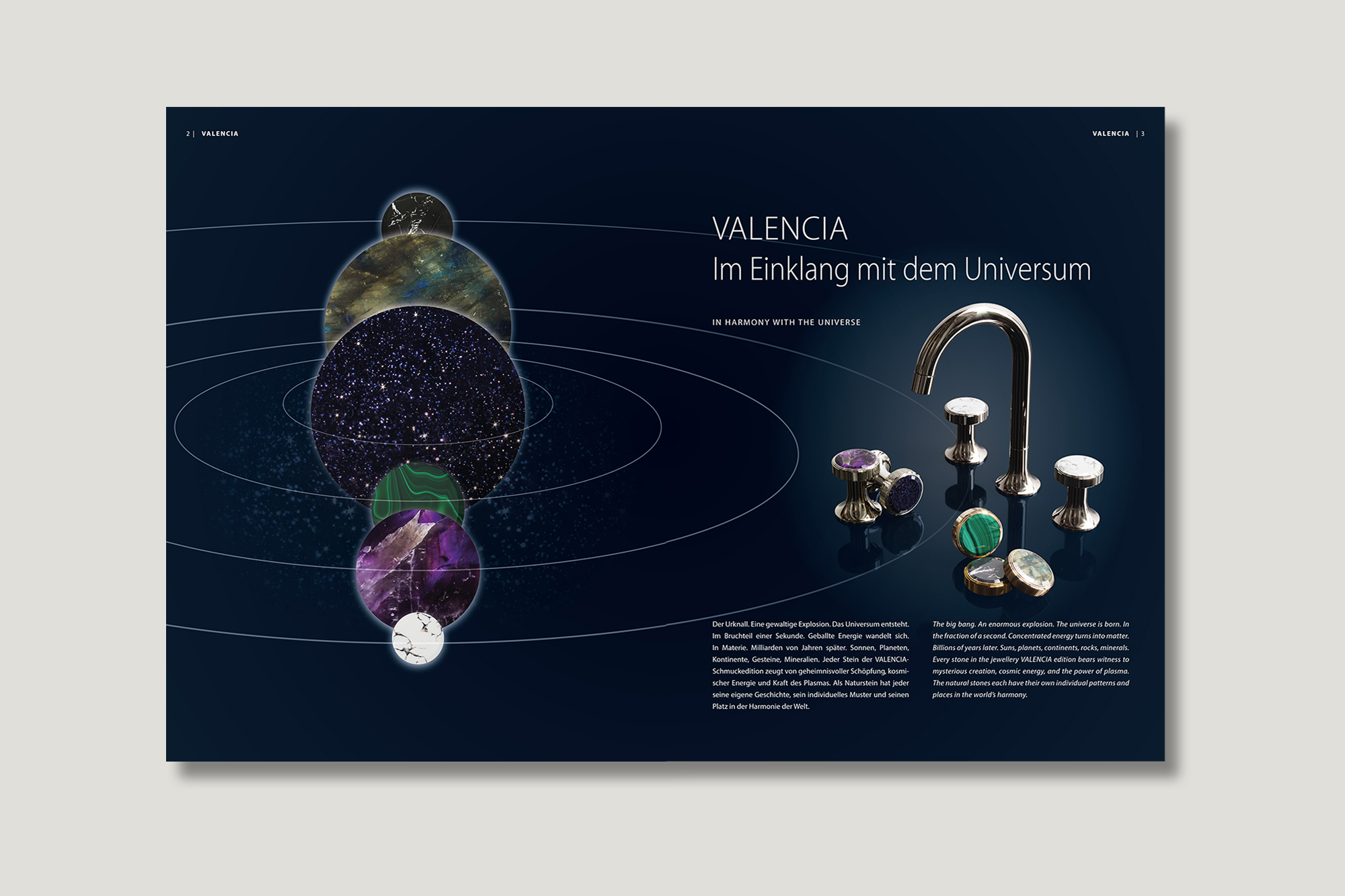 Badinspirationen der Extraklasse – im Einklang mit dem Universum. Jörgers neue Broschüre inszeniert die spektakulär schöne „Valencia“-Schmuckstein-Edition. Sechs Aufsehen erregende Baddesigns zelebrieren die Einzigartigkeit der sechs Natursteine in Verbindung mit exklusiven, luxuriösen Oberflächenveredelungen aus hauseigener Produktion.