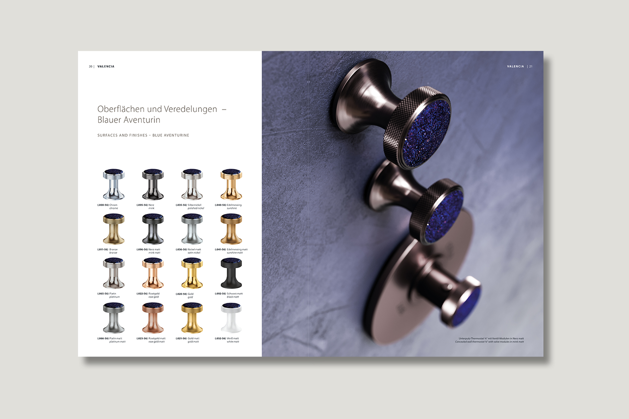 - Komplette Übersicht über das umfangreiche und vielfältige Programm der „Valencia“-Kollektion – mit Produktinformationen inklusive technische Daten zu allen Armaturen und Accessoires für Waschtisch, Wanne, Dusche, Bidet und WC – sowie über alle neun erhältlichen Griffoptionen in Kombination mit 16 Oberflächen und Veredelungen aus eigener Produktion