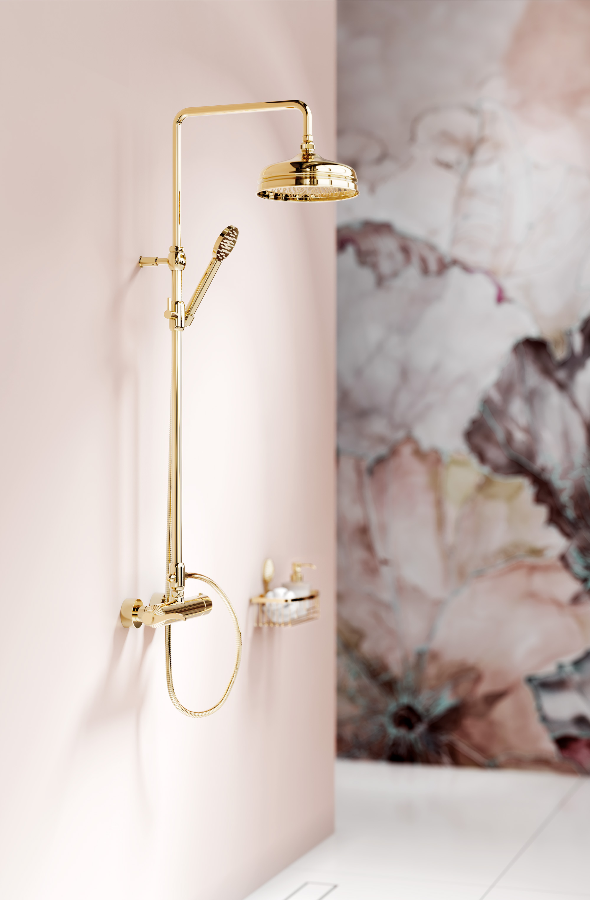 Nomen est omen: „La vie en rose”. – Kunstvoll, kreativ und souverän komponiert, bezaubert der neue, bildschöne Badentwurf von Jörger Design durch romantisches Ambiente, charmanten Luxus und stimmungsvolle Sinnlichkeit. In der Hauptrolle die eleganten „Cronos“-Armaturen im exklusiven Finish Edelmessing und dazu die im Design perfekt abgestimmten, veredelten Accessoires.