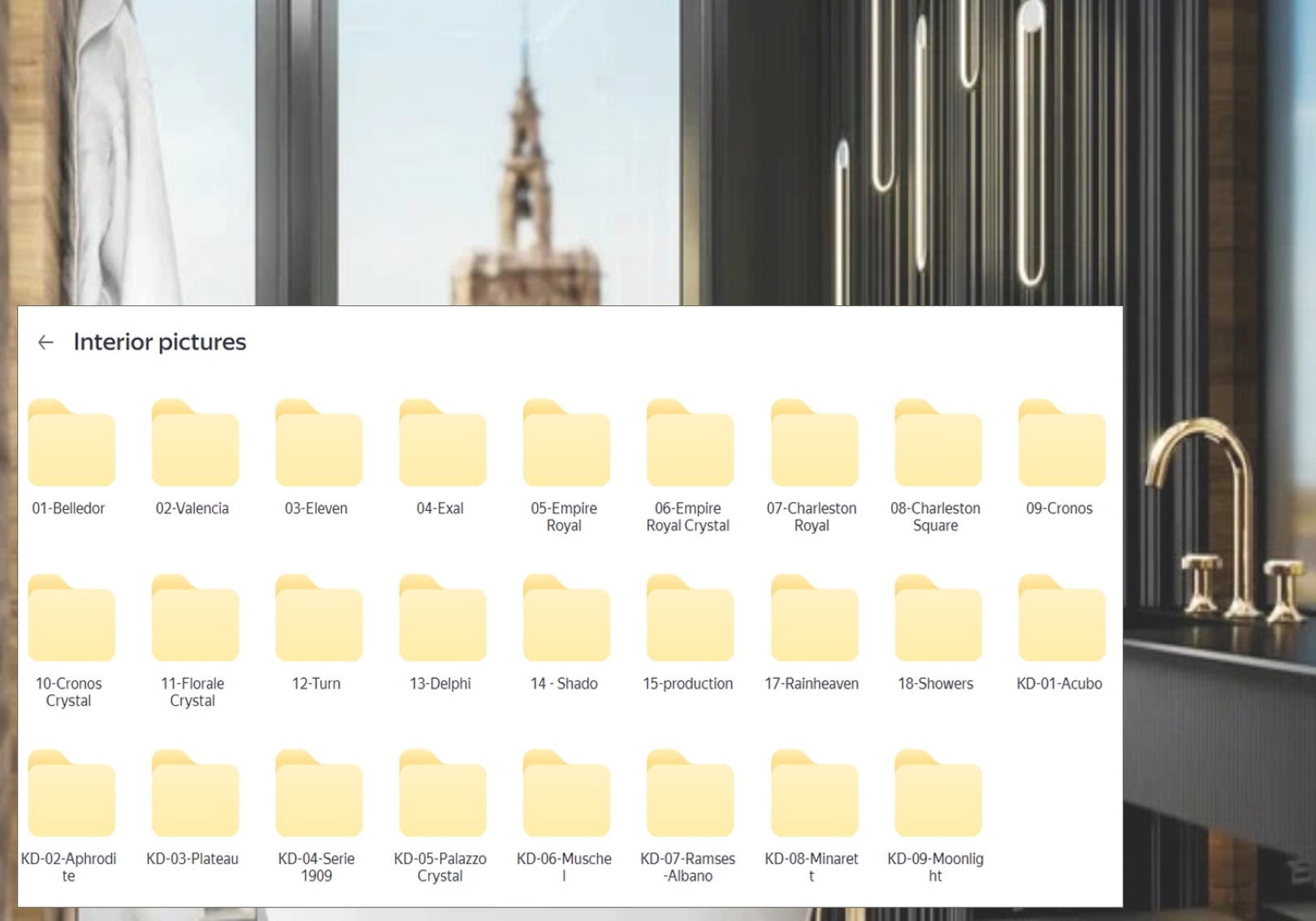 Die Struktur dieses Bereichs ist klar und benutzerfreundlich. Jede Armaturen-Serie liegt in einem eigenen Ordner – etwa Belledor, Eleven, Valencia, usw. In separaten Ordnern finden sich Aufnahmen von Kopfduschen oder Handbrausen („Shower“) und großen Regenbrausen („RainHeaven“) in allen verfügbaren Varianten, Größen und Oberflächen.
