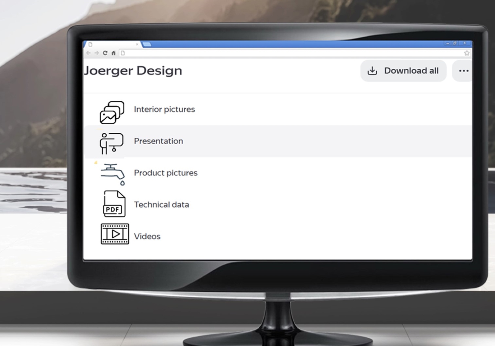 Dieser Bereich ist analog zu „Interior Pictures“ aufgebaut: Jede Armaturen-Serie hat einen eigenen Ordner. In weiteren Ordnern werden Küchenarmaturen von JÖRGER DESIGN sowie Regenbrausen präsentiert. Im Unterordner „Jörger Samples“ finden sich zudem drei Videopräsentationen zu Natursteinmustern der Luxus-Serie Valencia und zu galvanischen Oberflächen.