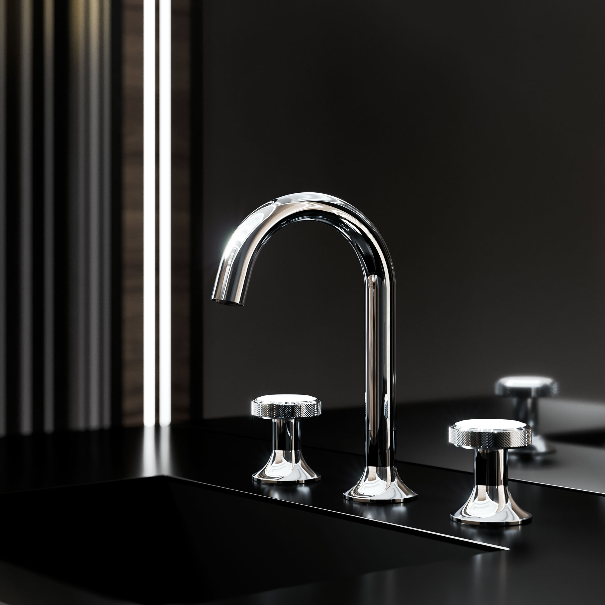 Der neue Designvorschlag will alle Liebhaber eines klaren, edlen und modernen Stils ansprechen. Er inszeniert „Valencia“ in Chrom mit weißen Kristallen in einem großzügigen Bad-Interieur.