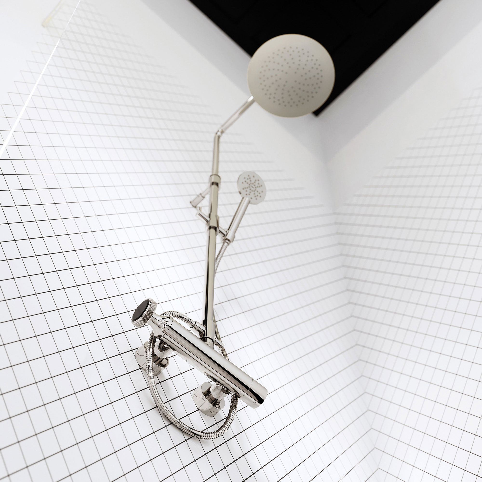 Die Badeinrichtung von Jörger Design basiert auf einer ausgewogenen Komposition und der Verwendung langlebiger Materialien. Eine vielseitige Farbpalette und schlichte Farbtöne tragen zur zeitlosen Eleganz bei. Selbst die hellen Keramikfliesen wirken mit ihren klassischen geometrischen Mustern neben der warm schimmernden Oberfläche in Silbernickel eher dezent statt dominant.