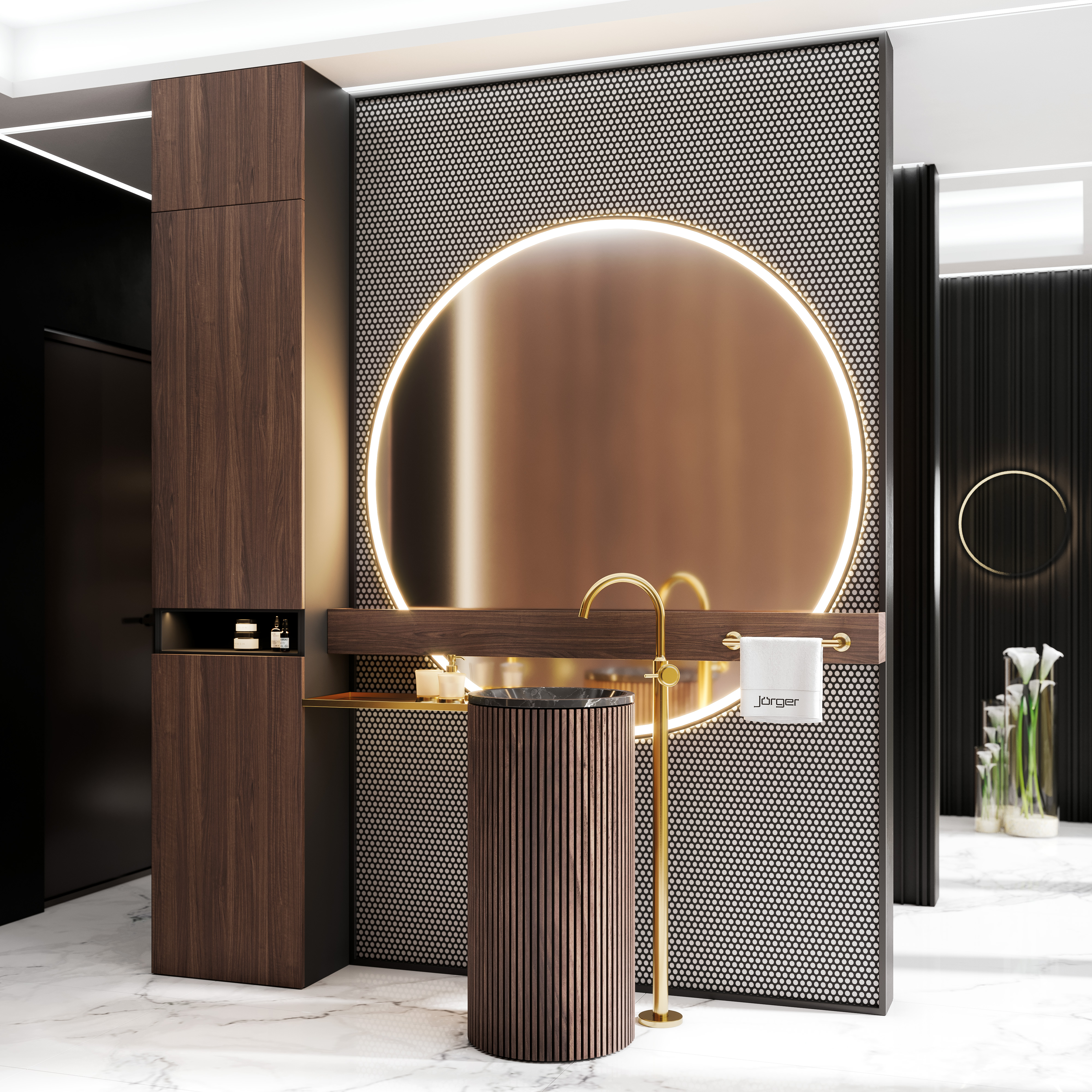 Die Design-Manufaktur Jörger hat ihr Oberflächenangebot trendbewusst um den warmen Metallton „Mattgold“ erweitert. Und sie führt ihn effektvoll als wesentliches Designelement ein.