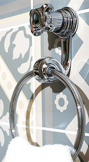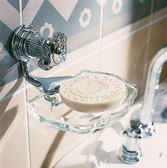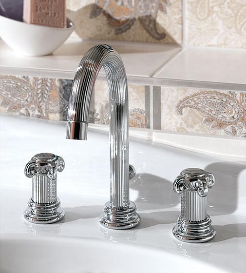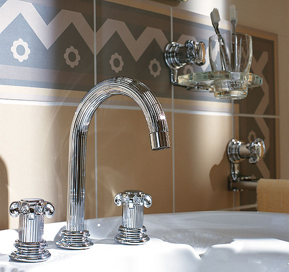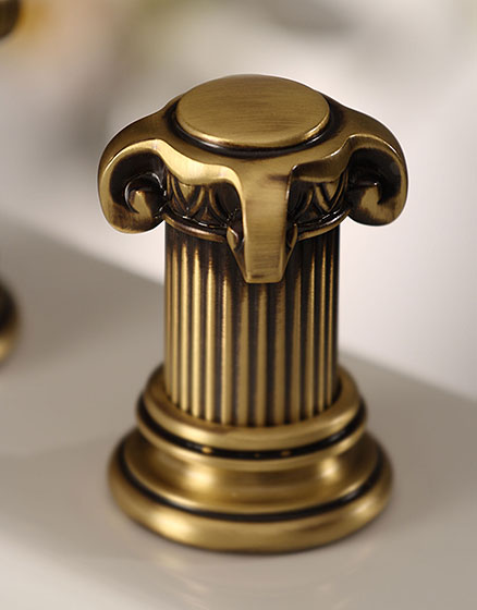 Die stilvolle Formensprache ist im gesamten Sortiment für Waschtische, Wannen, Brausen und Bidets und den vielfältigen Accessoires vollendet umgesetzt: Körper, Griffe und Rosetten nehmen die Form einer Säule konsequent auf. Exklusive, von Hand verarbeitete Oberflächen veredeln die außergewöhnliche Gestaltung im Badezimmer harmonisch.