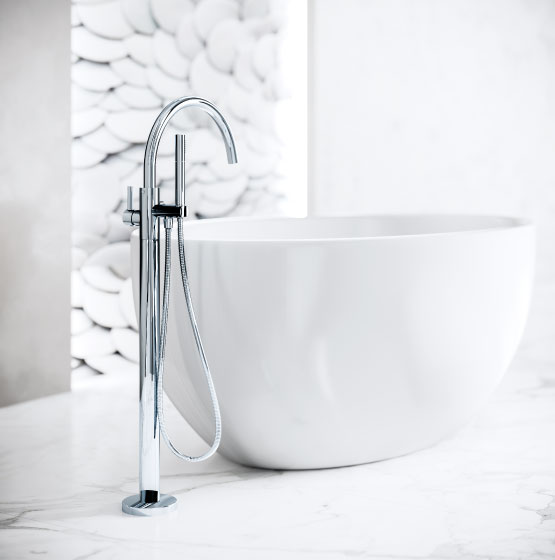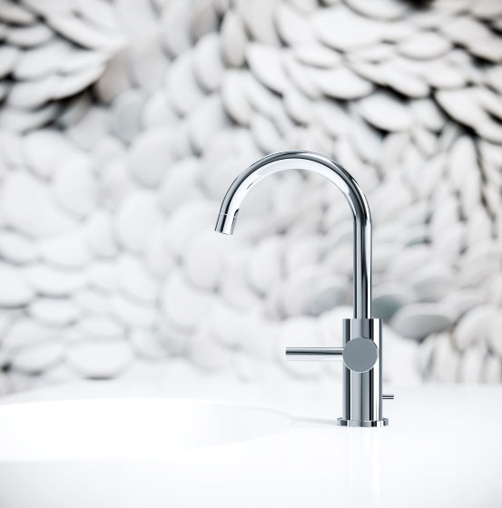 Konsequent folgen die Armaturen-Elemente und die vielfältigen Accessoires der klaren, runden Formensprache in der Gestaltung. Zeitlose Eleganz vermittelt der schlanke, schlichte Bogen, der stilbildend ist für das gesamte Bad-Sortiment von Waschtischen, Brausen und Bidets bis zu Wannen.
