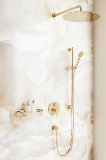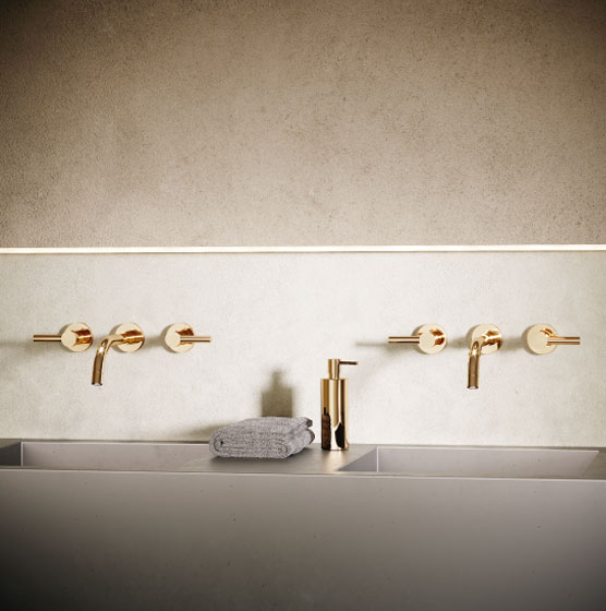 Die kleinen, kompakt gestalteten runden Hebel setzen in Verbindung mit den geraden Einhand- und Zweihand-Griffen spannende Akzente. Exklusive, handverarbeitete Oberflächen vollenden das klassisch moderne Baddesign.