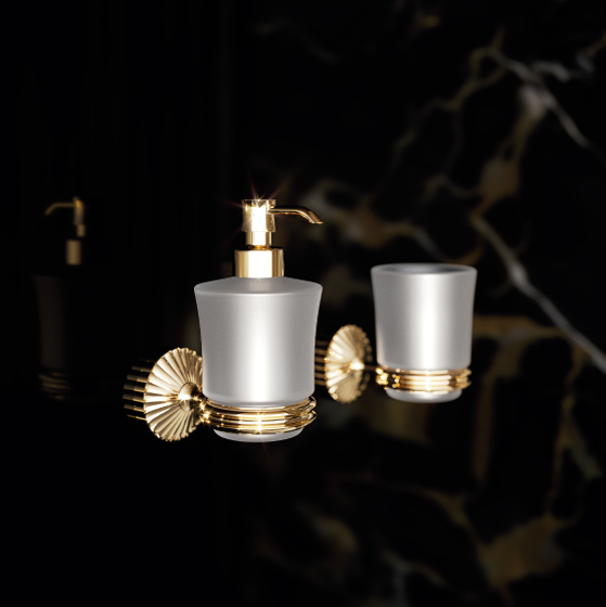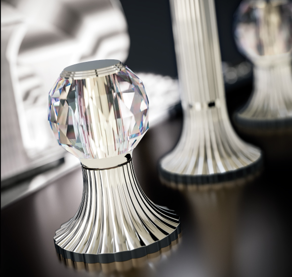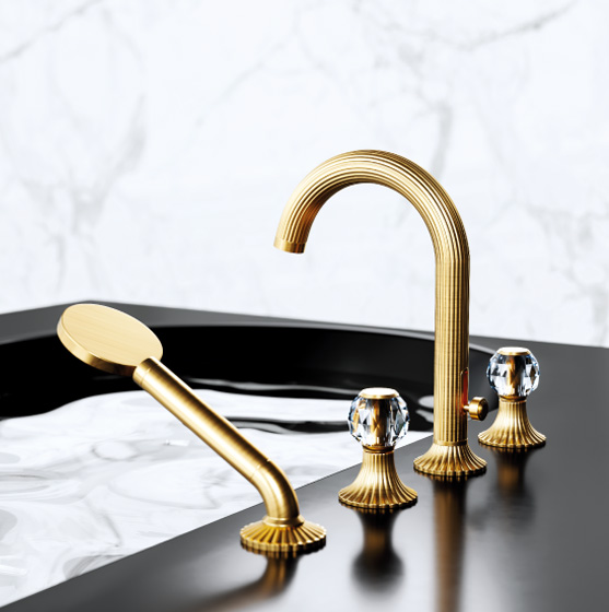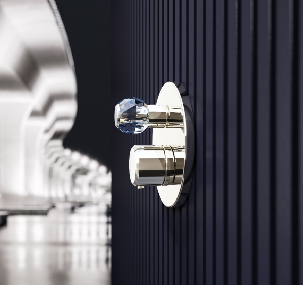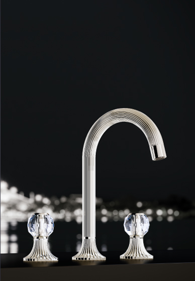 „Cronos Crystal“ bietet ein umfangreiches Sortiment an Armaturen für Waschtisch, Bidet, Badewanne und Dusche mit Kristallgriffen. In vielfältigen Accessoires ist die einzigartige Formensprache durchgängig in der elegant geriffelten Rosette umgesetzt. Stilgerechte, in Handarbeit bearbeitete Oberflächen vollenden das exklusive Bad-Design.