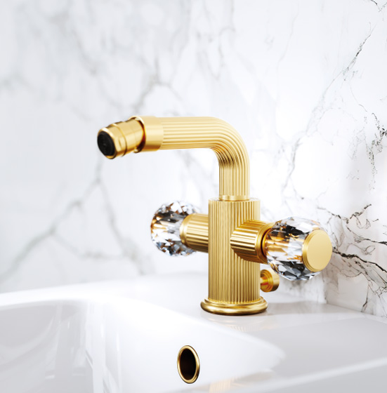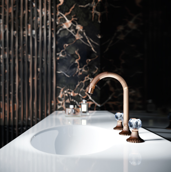 Mit dem Entwurf der Armaturenserie „Cronos Crystal“ verbindet Oliver Jörger modernes Design mit dekorativen Motiven nach dem Vorbild der antiken griechischen Architektur. An klassische Säulen erinnernd, prägen feine Rillen Auslauf und Körper der schönen Badarmatur.