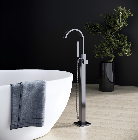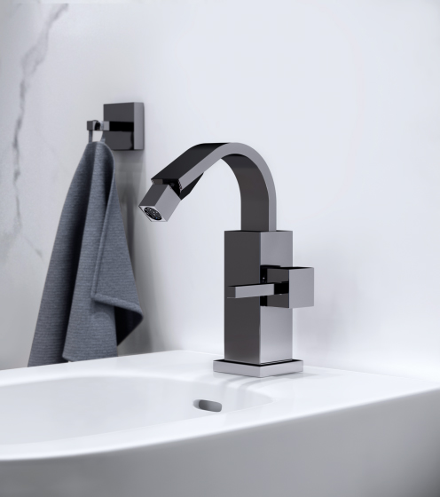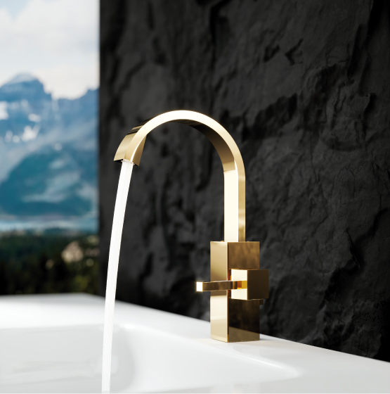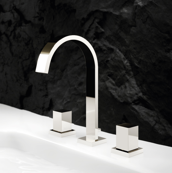 Charakteristisch ist der lange, breite Bogen, der aus dem dekorativen, rechteckigen Körper hervorgeht und die Badarmatur sehr elegant erscheinen lässt. Schlichte, kubische Einhand- und Zweihand-Hebel mit geraden Griffen setzen Akzente.
