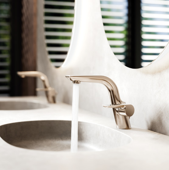Fließende Leichtigkeit prägt die Armaturen- und Accessoires-Serie „Exal“. Der Kranich mit seinem schlanken, zielgerichteten und pfeilförmigen Körper während des Fluges inspirierte Designer Oliver Jörger zum modernen Design von „Exal“. Die klare, einfache Form mit dem geschwungenen Auslauf, verleiht der Armatur ihren dynamischen Stil.
