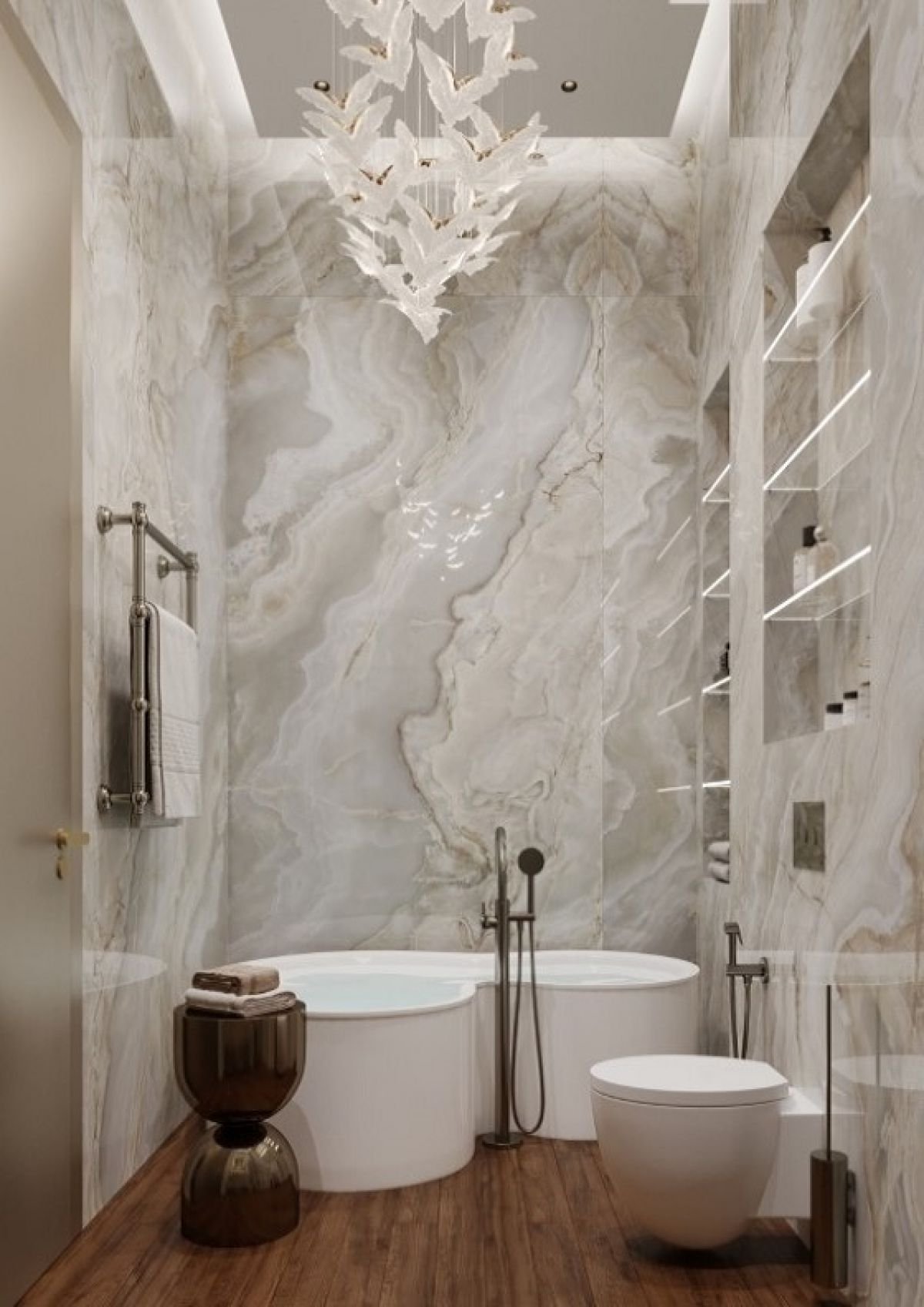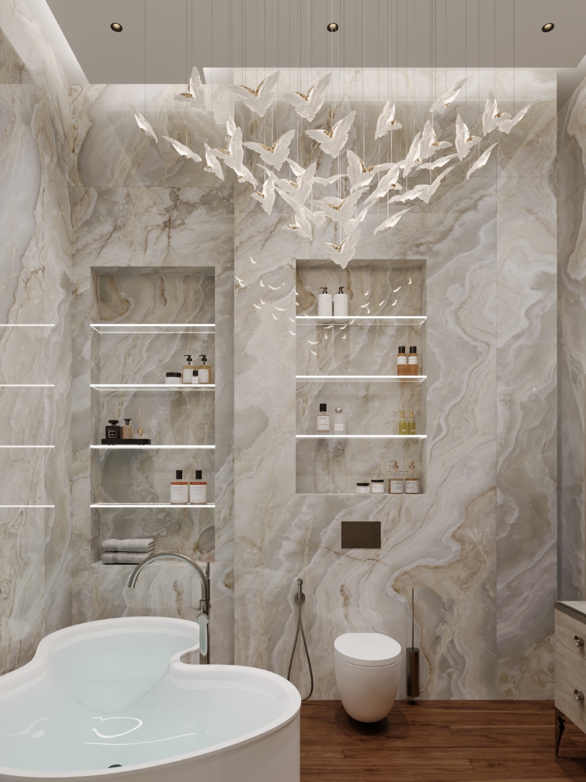 Das Badezimmer der Tochter wirkt zarter und poetischer: frische Aquarellfarben mit Aquamarinnoten und kühlem Grün, ein „Spielzeug“-Lollipop-Couchtisch, eine ungewöhnlich geformte Badewanne und ein Kronleuchter mit Vogelfiguren. Das Duo aus natürlichem Teakholz und keramischem Feinsteinzeug „onice-iride argento“ der Marke La Fabbrica vermittelt das wunderbare Gefühl, auf einem sonnenverwöhnten Deck mit Blick auf die unendliche Weite des Meeres zu spazieren.