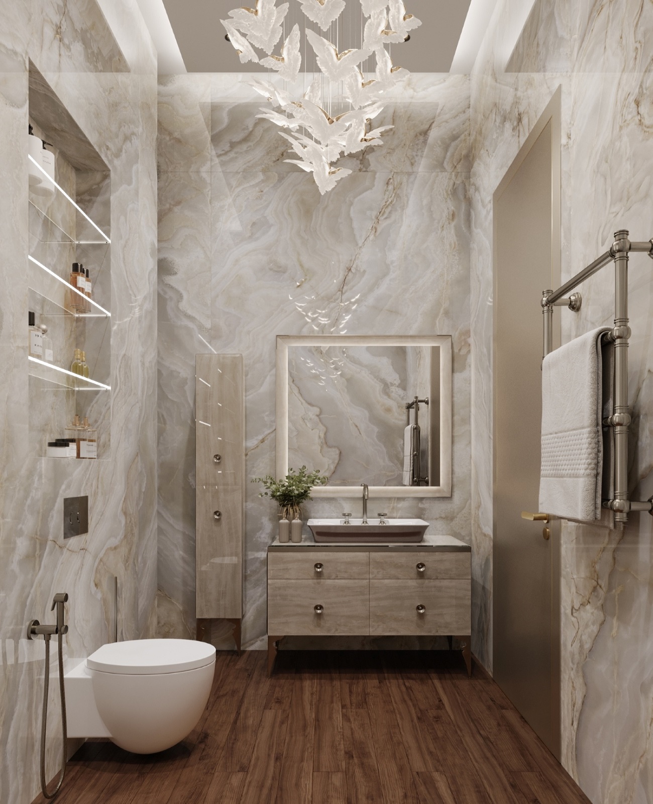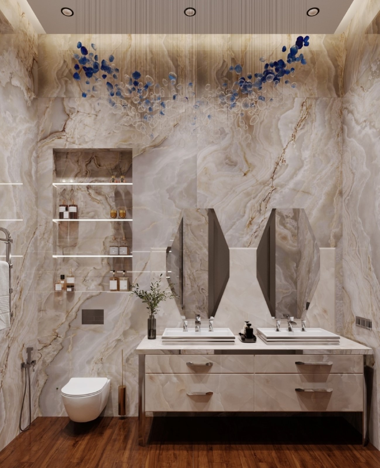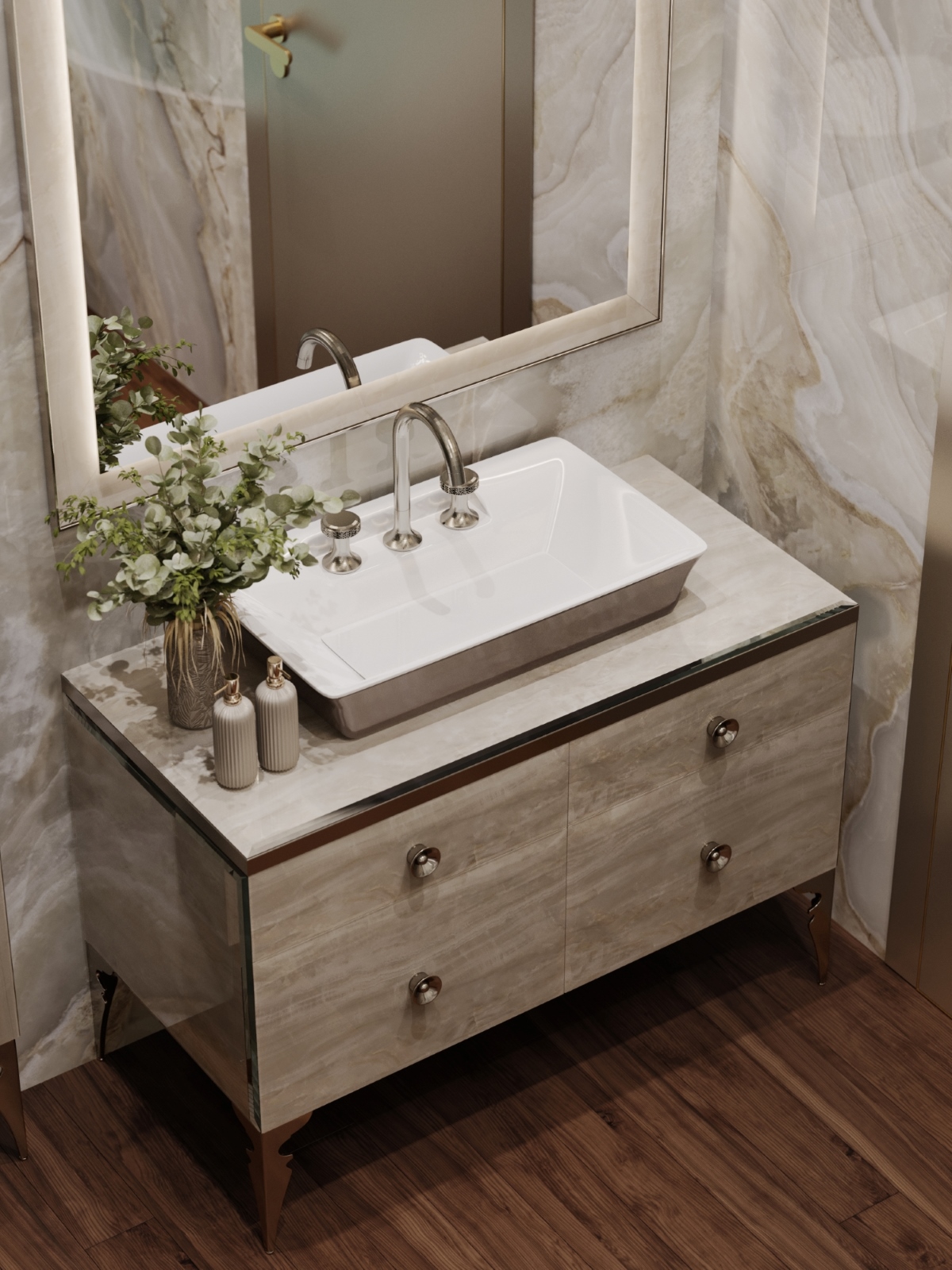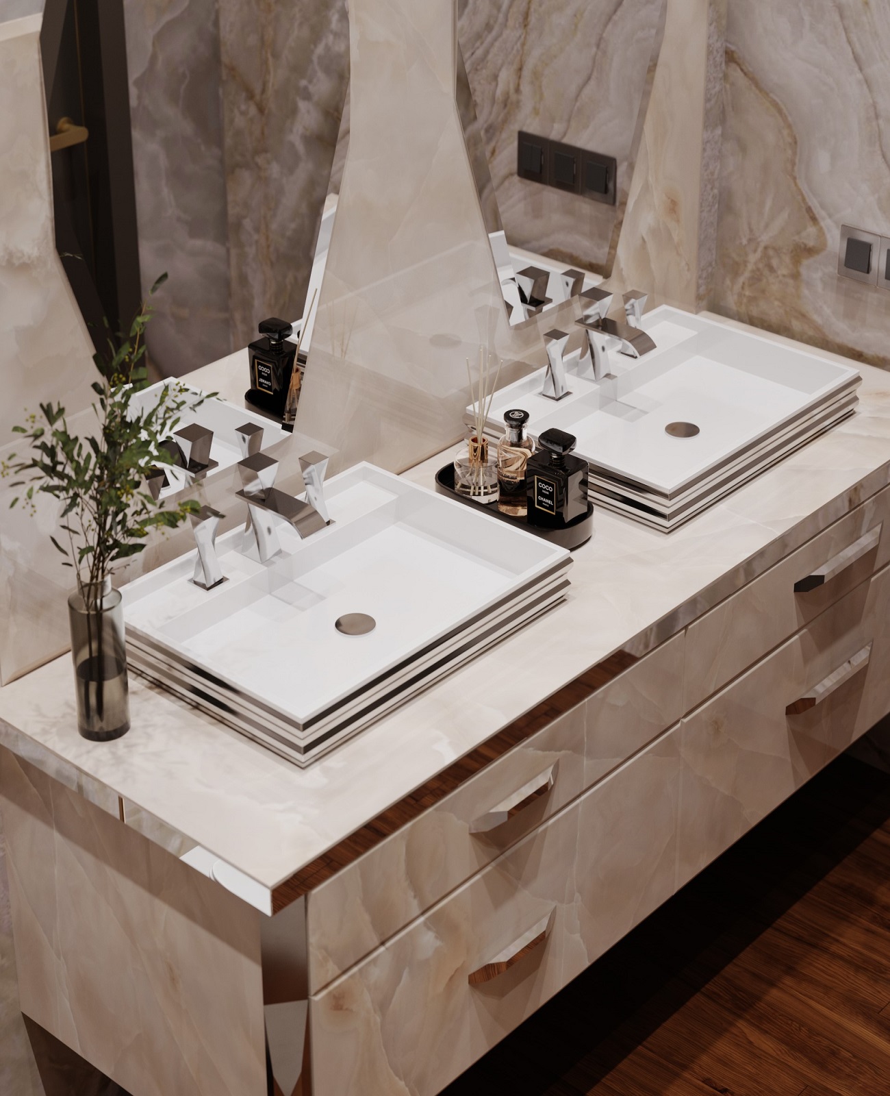 Das sandig-beige Thema wird durch ein Wandpaneel aus Glas und einen Unterschrank für zwei Waschbecken der italienischen Marke Mildue in „onice gold“-Optik ergänzt. Abgerundet wird das elegante Ensemble durch zwei Wandspiegel von Mildue in Form eines verlängerten Achtecks mit Fassung und LED-Beleuchtung.