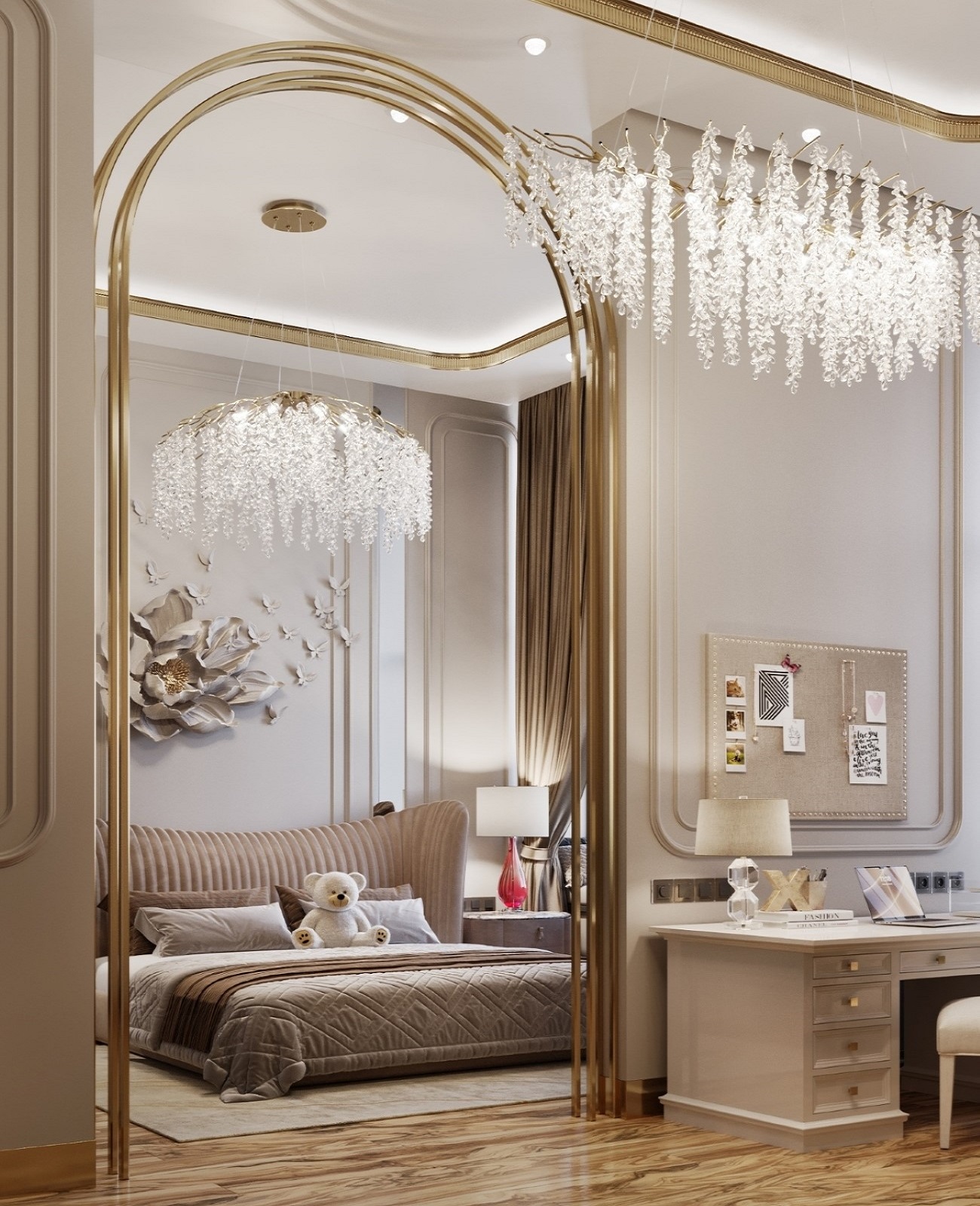 Das Apartment für eine Familie mit Kind ist bewusst in einen gemeinsamen Bereich mit Flur, Essküche und Wohnzimmer und einem privaten Bereich mit Schlafzimmern unterteilt. Besonderes Augenmerk wurde dem Stauraum gewidmet: jedes Schlafzimmer verfügt über ein geräumiges Ankleidezimmer. Die Innenräume sind luftig und hell: hohe Decken und der vertikale Wechsel von Trennwänden, Wandpaneelen und Vorhängen betont die Proportionen – eine versteckte Beleuchtung, glatte Linien und schöne Rundungen an der Decke harmonisieren den Raum. Kunstvolle integrierte Objekte, subtil gesetzte Akzente, edle Materialien in der Wanddekoration – Messing, goldfarbenes Leder, naturbelassenes Holz – schaffen eine gemütliche, warme und anmutige Atmosphäre.