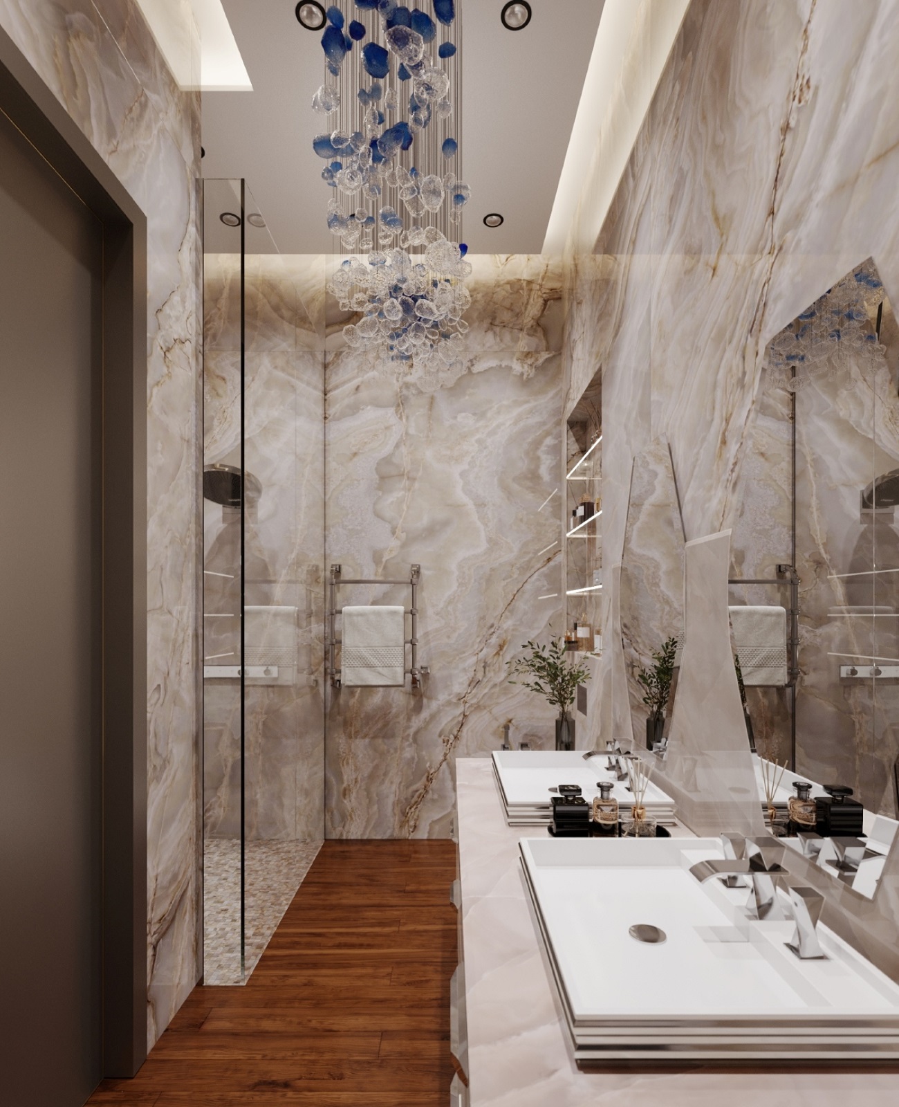 Die Wahl der Materialien für das Hauptbad taucht sanft, aber bestimmt in die ruhige Atmosphäre der Küstenlandschaft ein: ein Boden aus natürlichem Teakholz, eine Kieselsteinleiter und die transparente Panoramaverglasung der in die Nische eingebauten Duschkabine. Das großformatige Muster des keramischen Feinsteinzeugs „onice-iride malaga“ der Marke „La Fabbrica“ erinnert an die Spuren der Wellen im Sand, während der dekorative Kronleuchter aus schwerelosen weißen und blauen Glasblasen an ein Wolkengebilde am Hochsommerhimmel denken lässt.