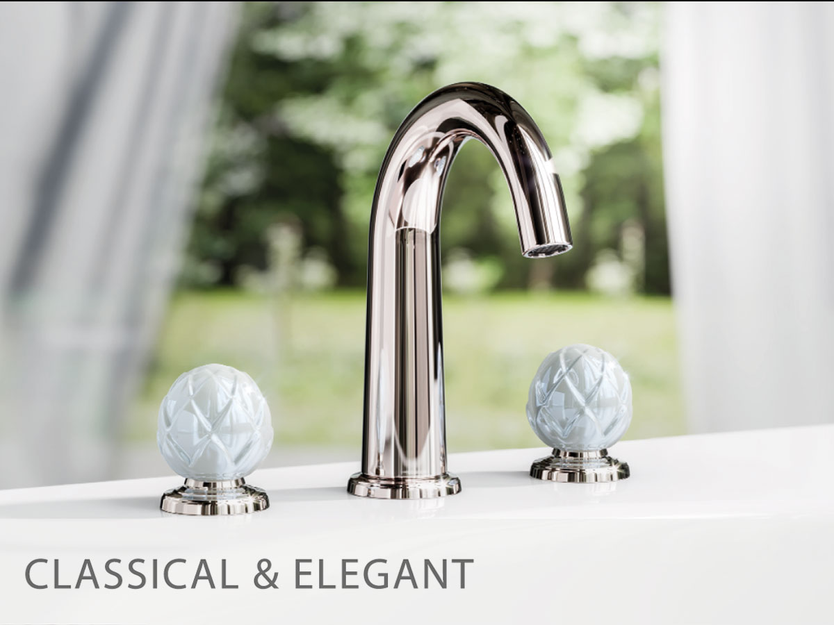 The refined and exclusive new mother-of-pearl-covered porcelain handles for the classically elegant “Belledor” series offer a particularly beautiful look when combined with polished nickel. This unique design solution for the fitting handles is another highlight from Jörger’s cooperation with the Fürstenberg porcelain manufactory.