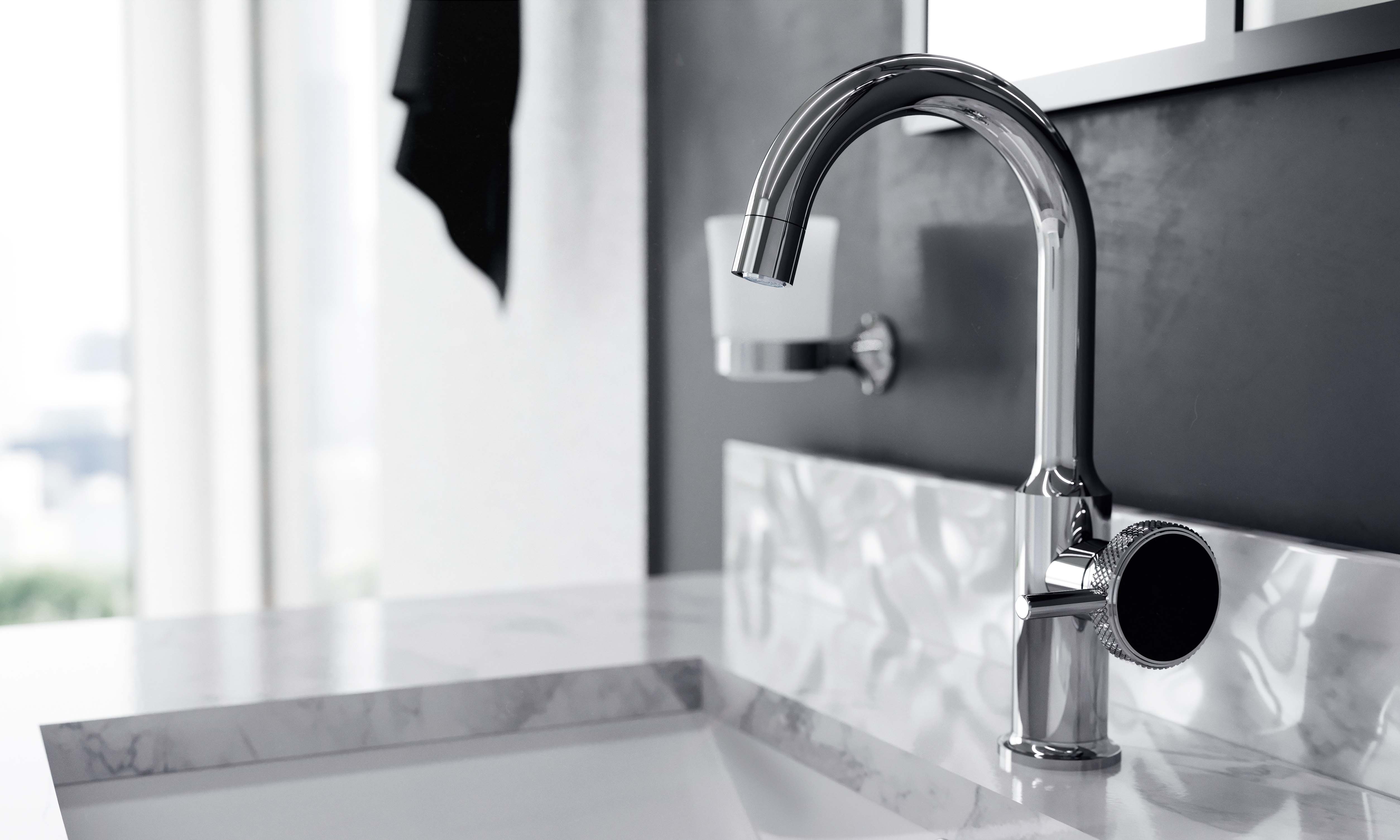 The modern character is defined in the stylistic elements of the industrial design, where the round handles are adorned with a ribbed edge. The raised, arched spout is straightforward and classically designed. An exciting contrast is created by the inlaid black crystals which create a luxurious look.