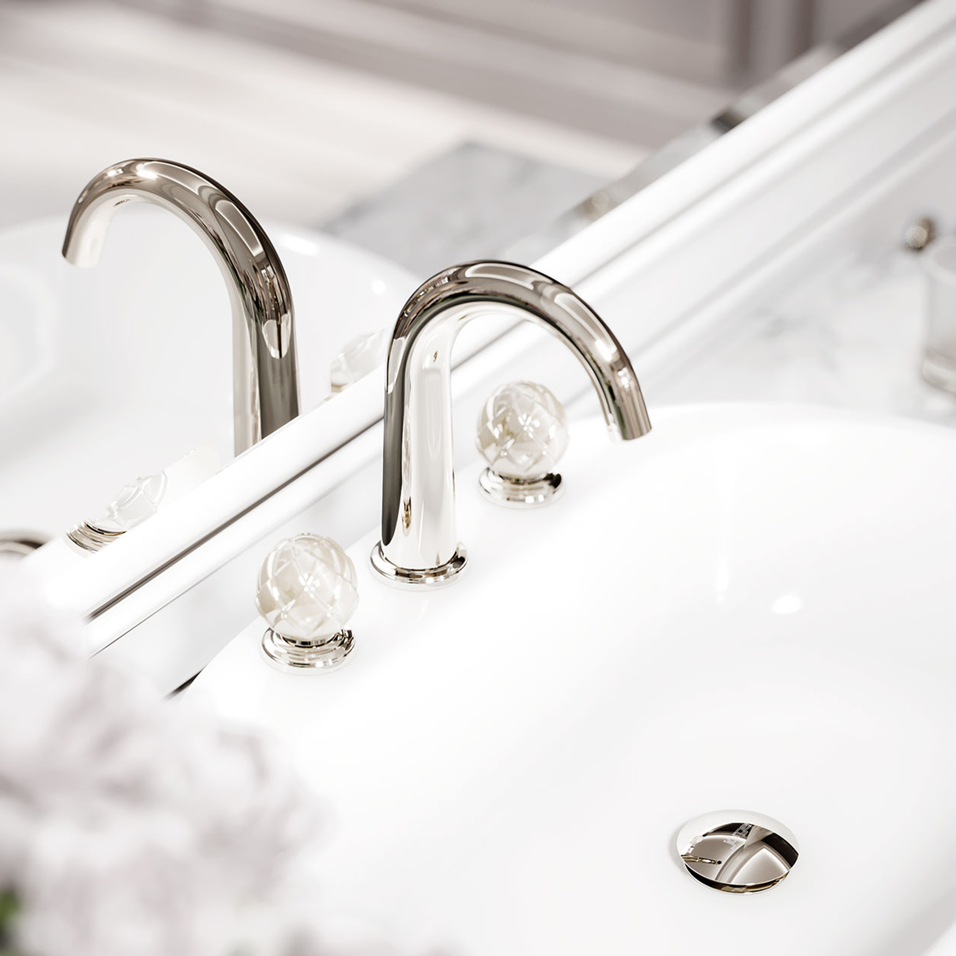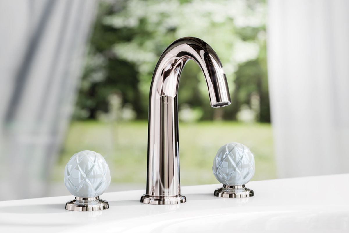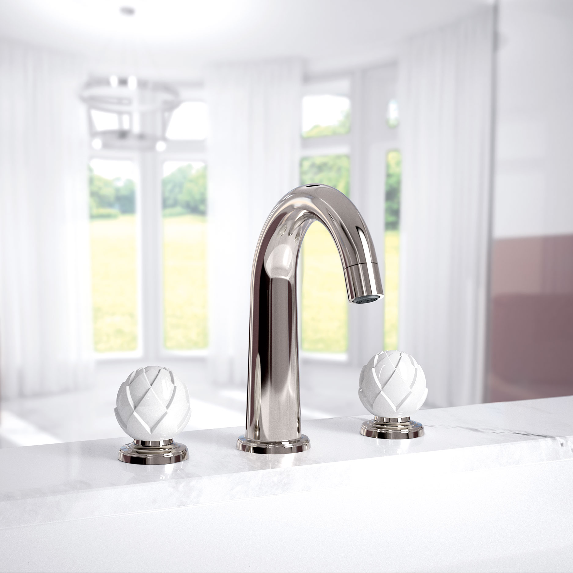 Mother of pearl porcelain handles, washbasin 3-hole mixer | series Belledor in polished nickel