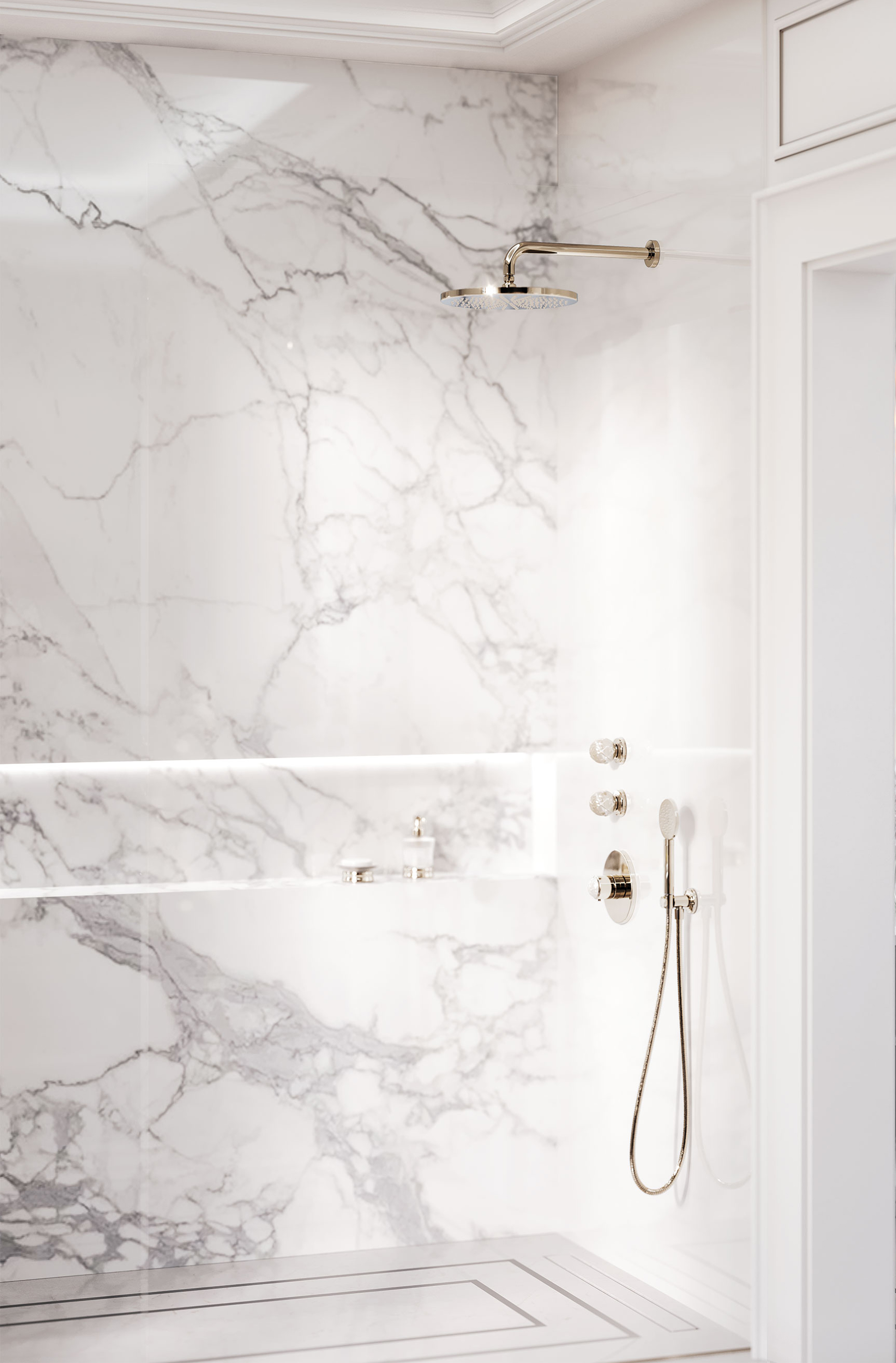 Concealed wall thermostat with concealed wall-valve-modul, shower combination and rain shower head | series Belledor in polished nickel with mother of pearl porcelain handles