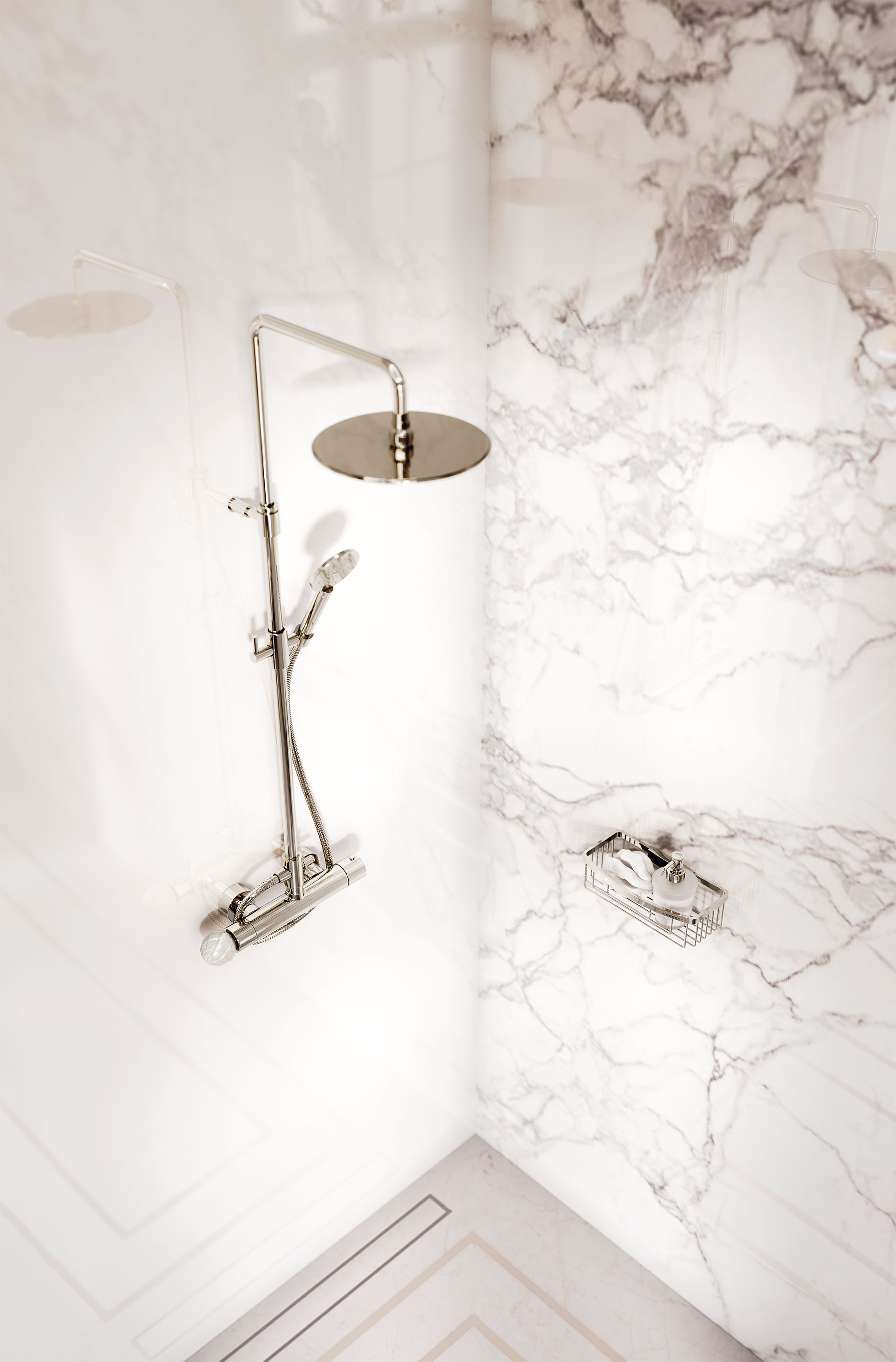 Exposed set with shower system, shower thermostat and sponge basket | series Belledor in polished nickel with mother of pearl porcelain handles