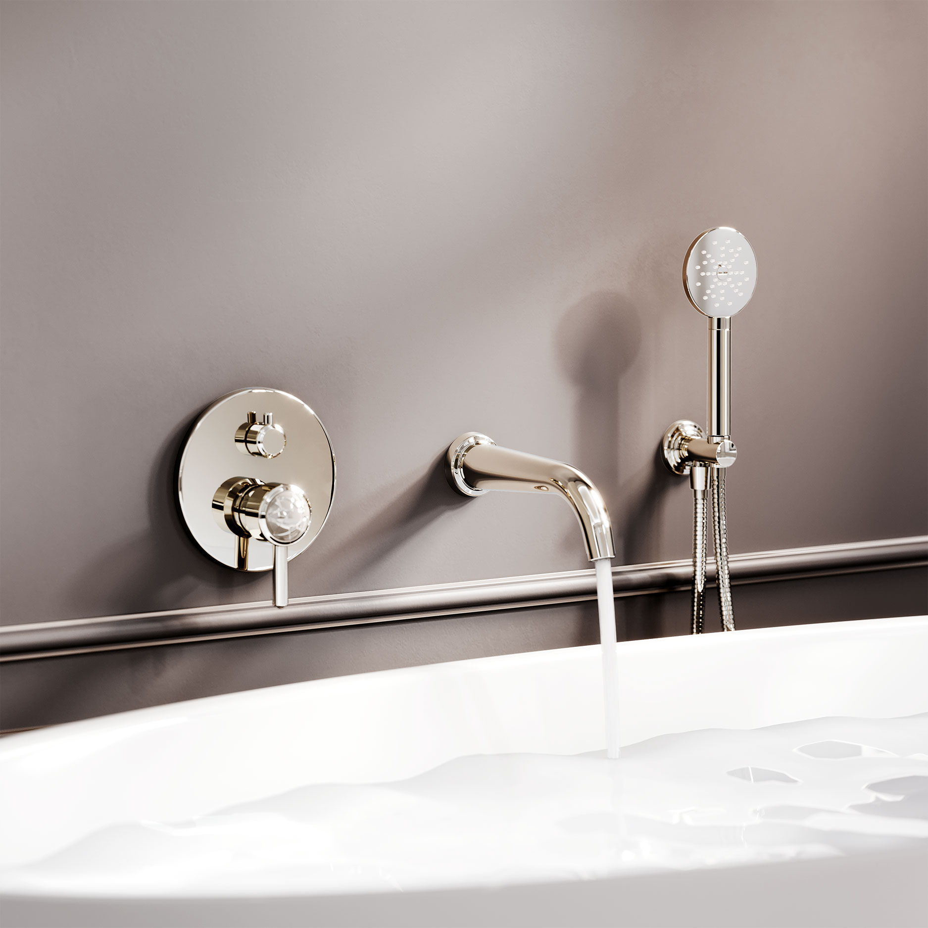 Concealed single lever wall tub and shower mixer, with wall spout and shower combination | series Belledor in polished nickel with mother of pearl porcelain handles